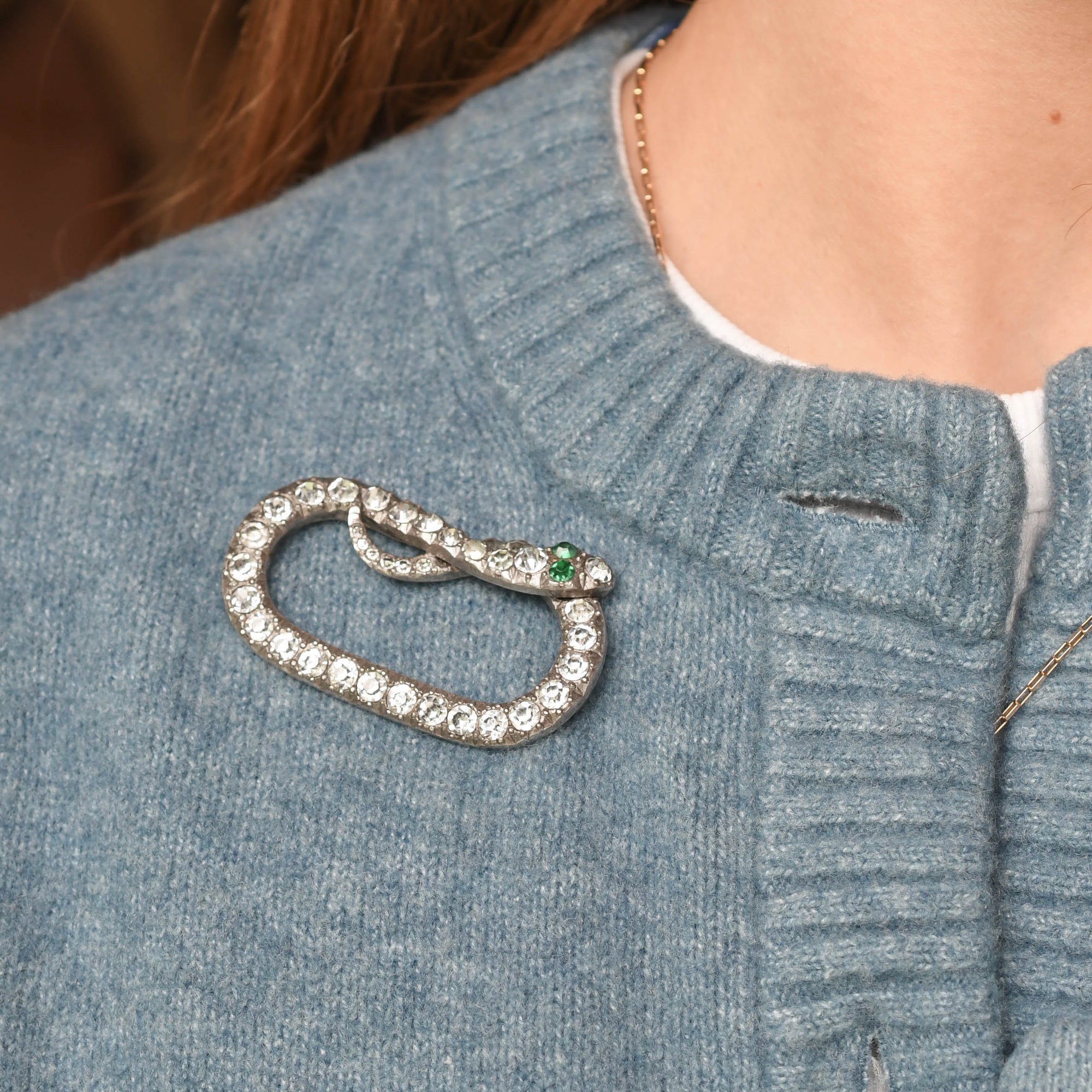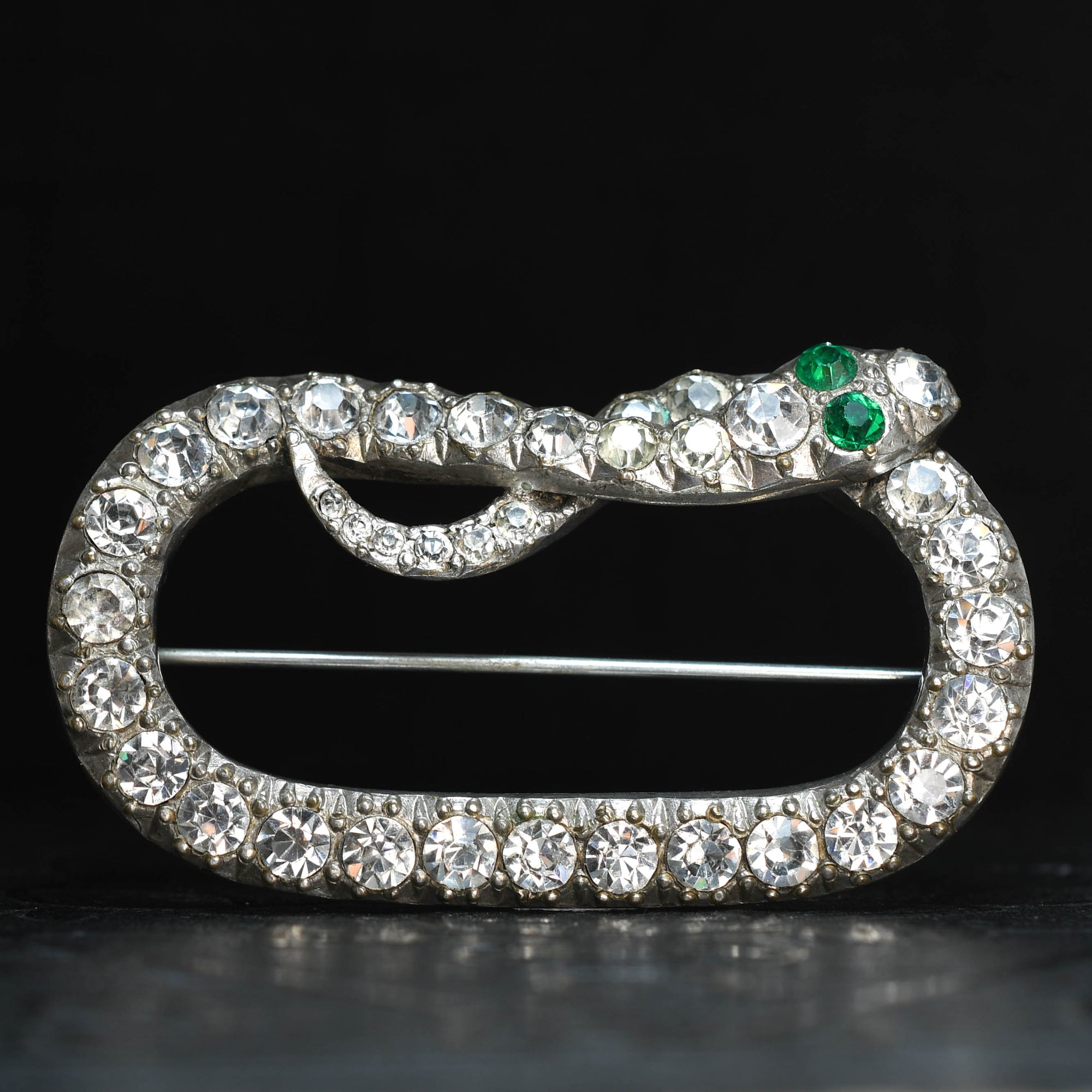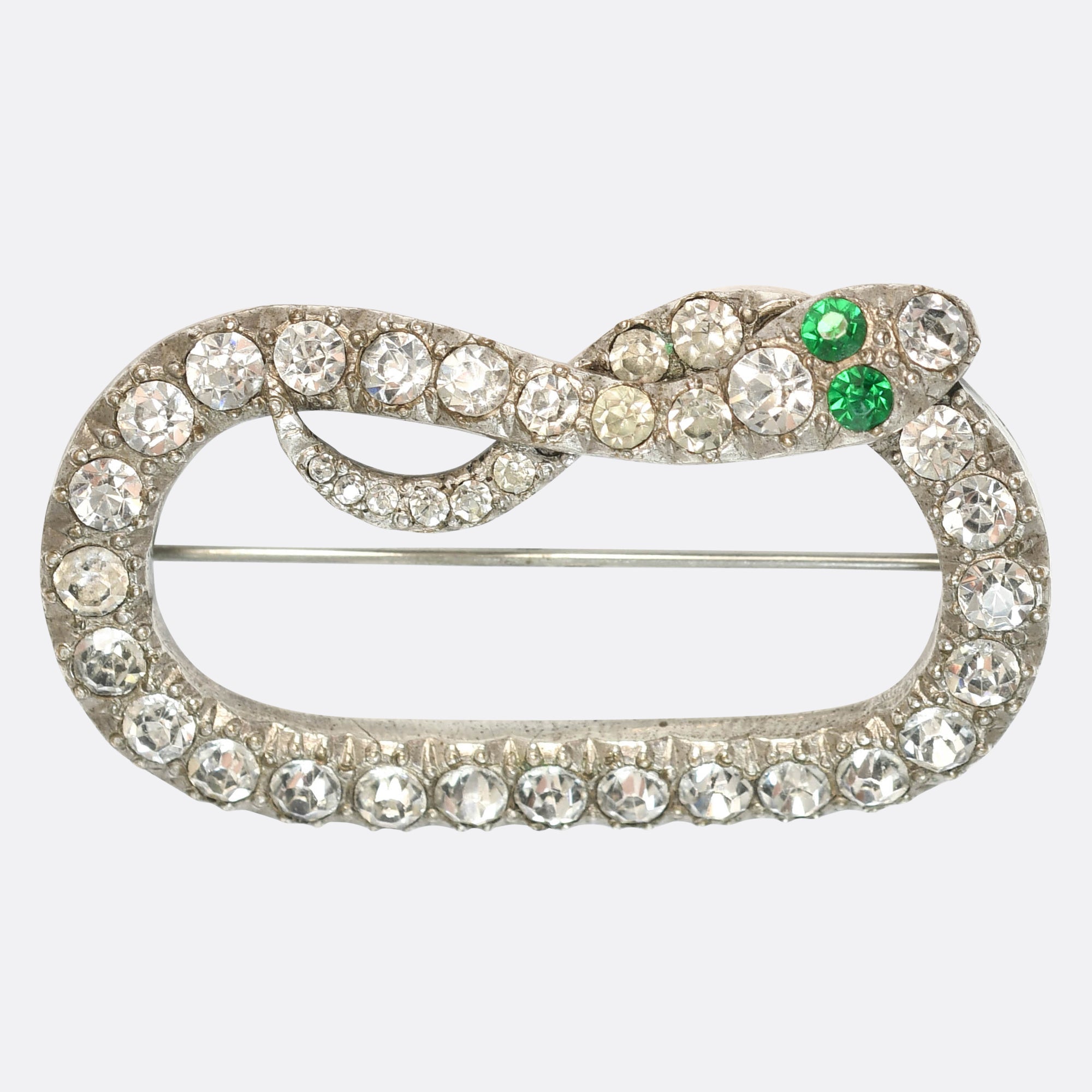 This charming 1920's brooch is modelled as the ouroboros/eternal loop snake. Its body is set with a single row of chunky white paste stones, with two striking green eyes! Its modelled in silver throughout and comes complete with a fitted velvet blue box. Ouroboros is an emblematic serpent of Ancient Egypt and Greece, represented with it's tail in it's mouth, continually devouring itself and being reborn from itself... Its a symbol that represents the concepts of eternity, infinite love and the natural cycle of life.