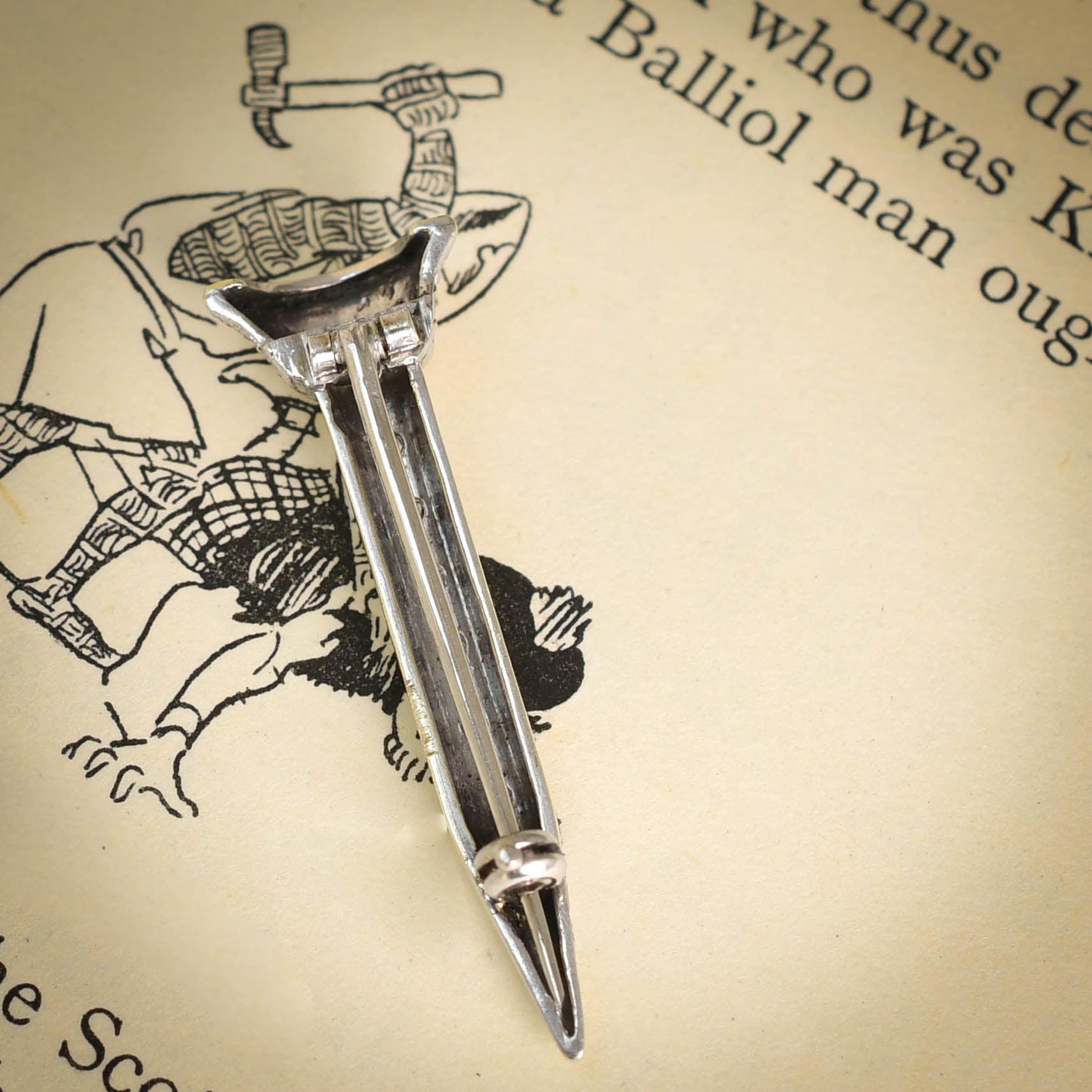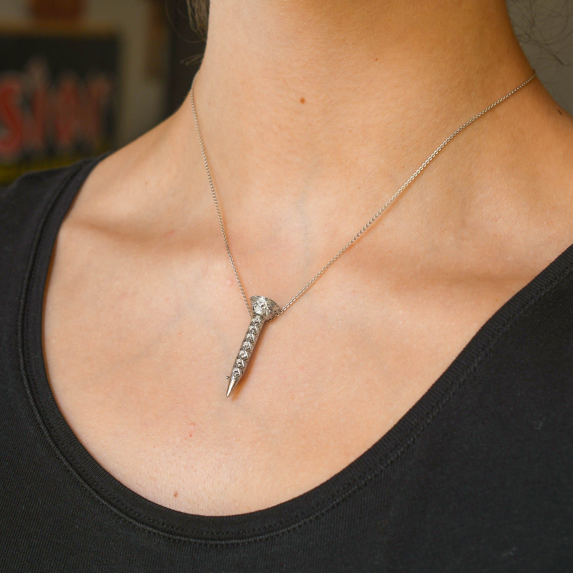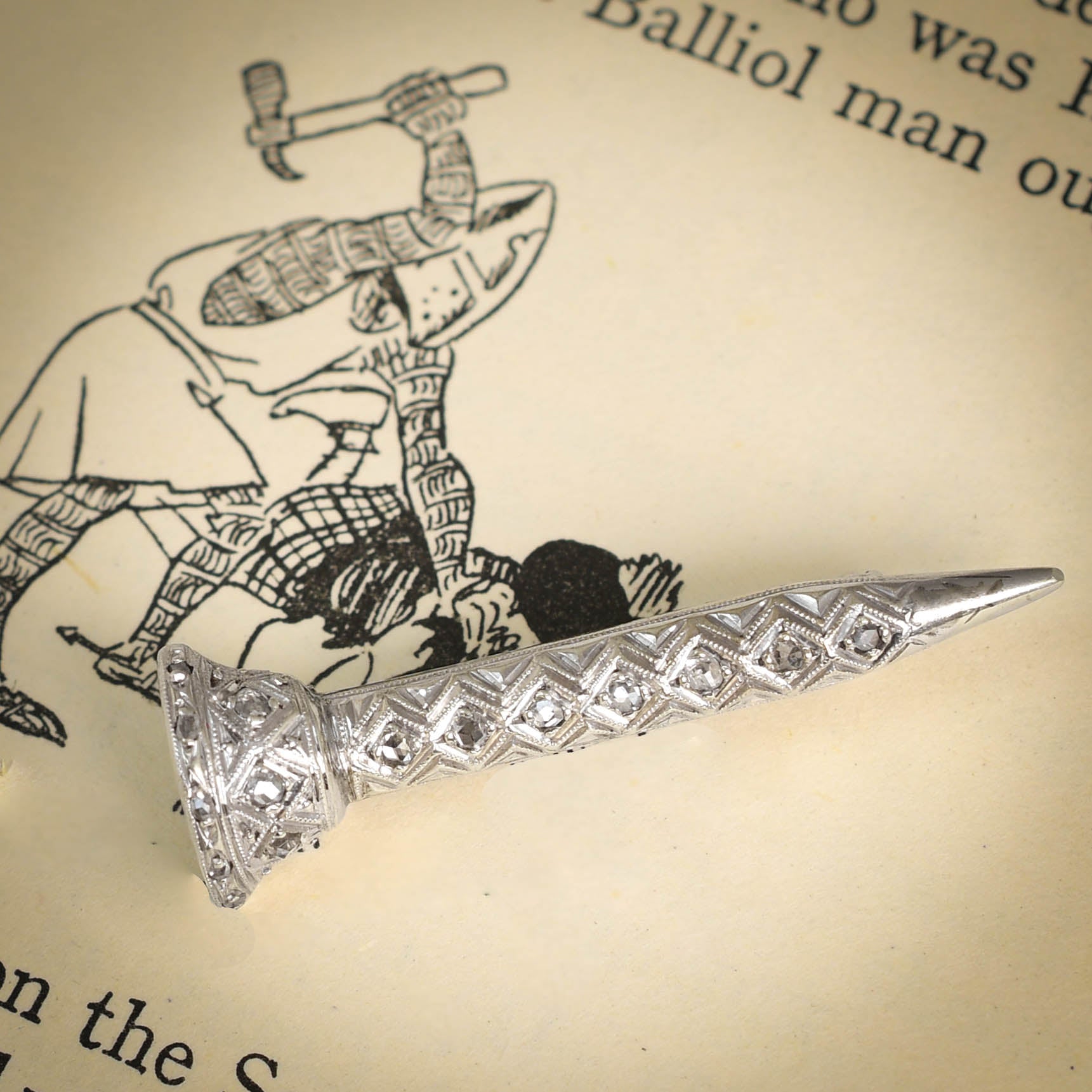 Here we have an Art Deco brooch/pin, modelled as a nail! Its crafted in 9k white gold throughout, set with charming rose cut diamonds amongst fine millegrain geometric design. Wear this as a little statement piece, as a symbol of strength and resilience.