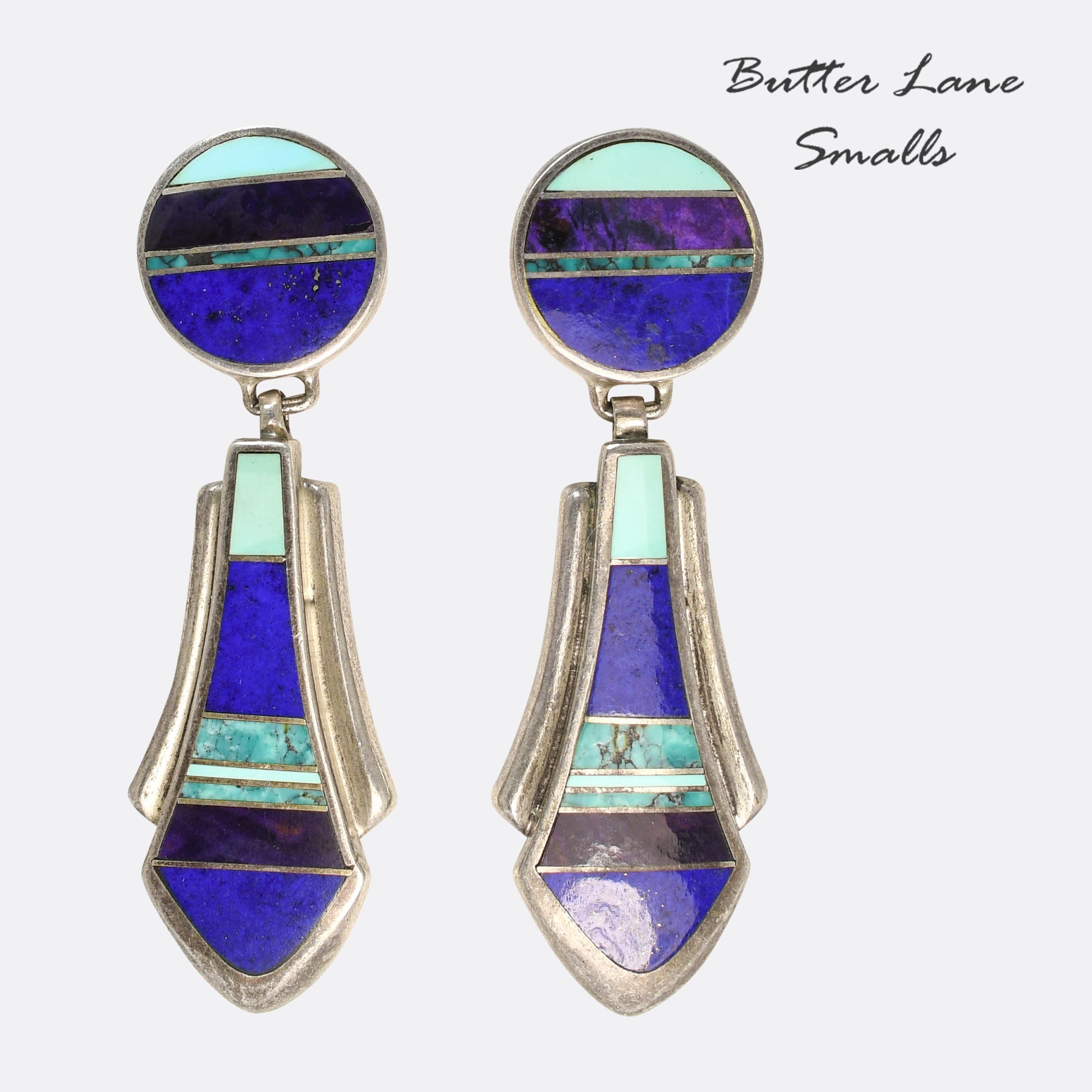 These super wearable pair of Navajo earrings date to the 1920's and are inlay set with vibrant stripes of stones and enamel. They're modelled in sterling silver throughout (stamped), and feature two large articulated drops from disc shaped tops. Each section is set with a gorgeous combination of lapis lazuli, turquoise, vibrant blue enamel and various agate and hardstones. They're worn with stud backs and drop around 2.1 inches from the ear.