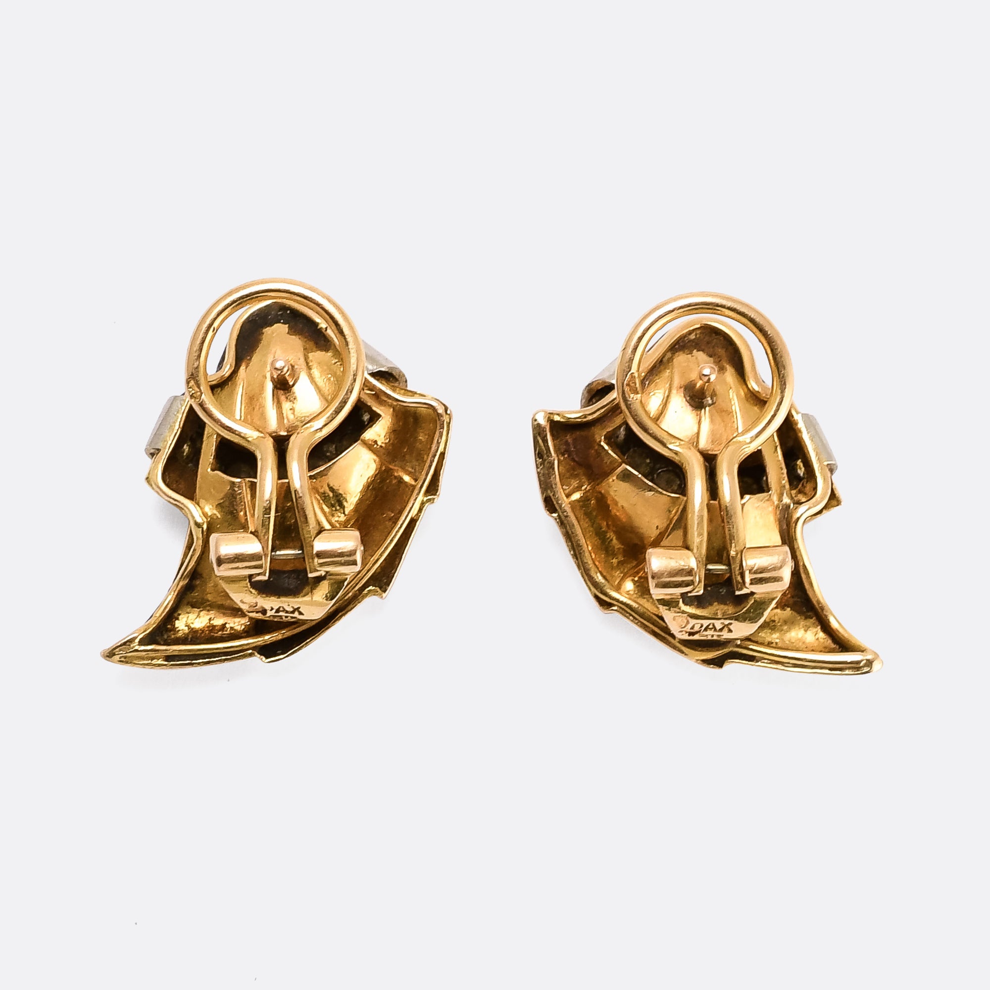 Striking 1980s modernist earrings in 18 karat gold and platinum. Crafted to look like... what? Nautilus? Dragon wings? Who knows, but they're exquisitely made and each set with a row of glistening white diamonds, the perfect foil to the rich gold patina. French control marks (eagle head and dog head) confirm the metals. With stud omega backs.