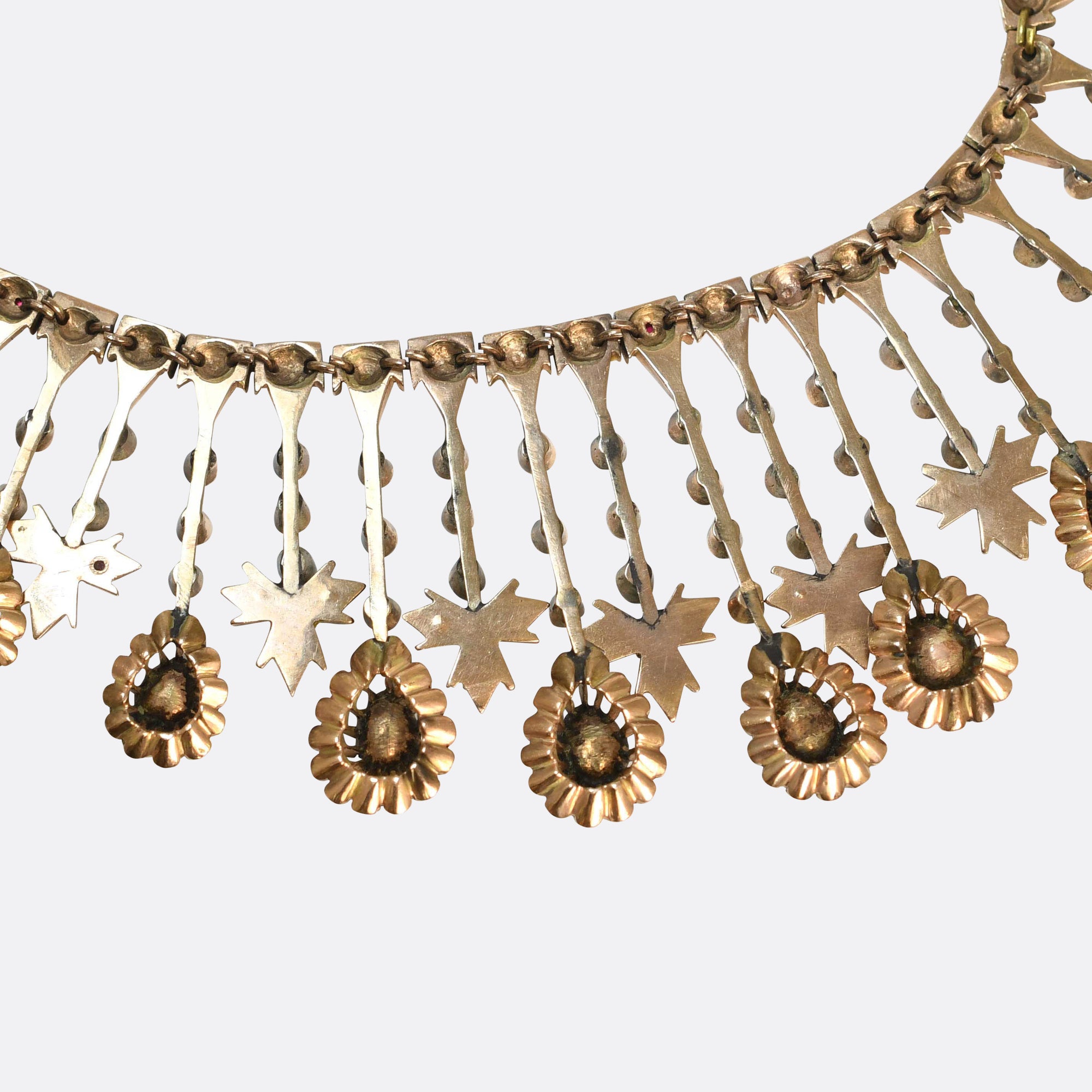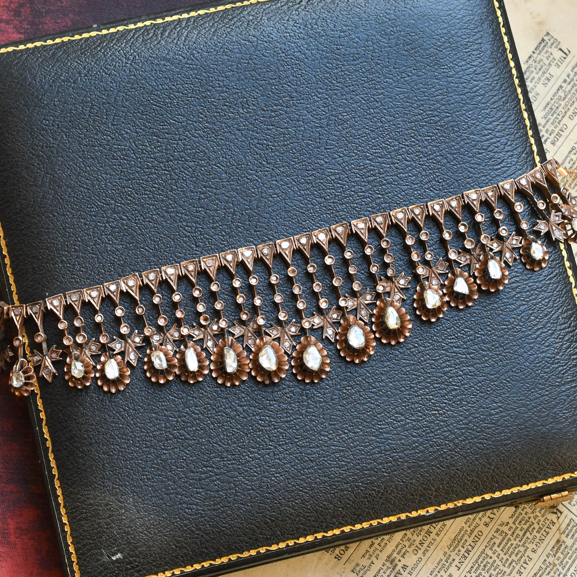 This amazing European antique boxed necklace dates from the 19th Century, circa 1820. Beautifully crafted in 14k rose gold throughout, the necklace features an arrangement of rose cut diamond drops, that are pieced together by diamond set bars and triangular motif tops, further set with the same stones. It has a lovely sinuous wear, resting lovely against the neck as each drop lays flat. The drops consist of almost clover like motifs and large scalloped openings with large stones in the centre. Each of the stones are foil backed, enhancing their beauty and brightness, and it fastens with a later added fine chain- with extra jump rings for wear at different lengths- 19.6 inches total length. Comes complete in its fitted box.