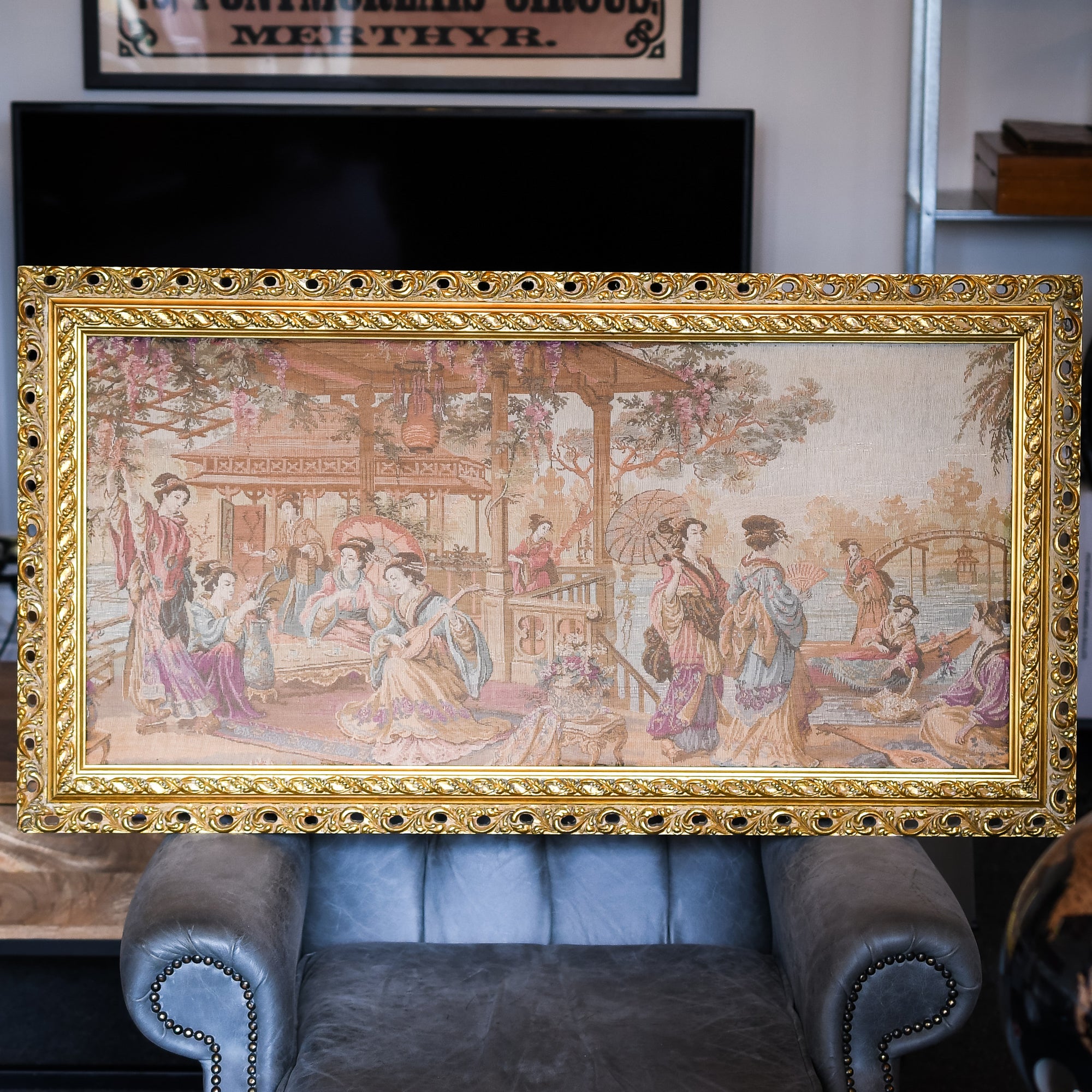 Remarkable antique tapestry depicting various geisha in a traditional Japanese garden with Shinto shrines, an arched bridge, and trailing flowers and foliage. The women are engaged in their particular specialties, including: lute playing, flower arranging, dancing, and conversation - potentially enjoying a day off as there don't appear to be any entertainees present. The level of detail is incredible, and, combined with the muted colour palette, the overall effect is strikingly beautiful. Particularly effective are the coloured kimonos and the trailing flowers and foliage. Mounted in an ornate gilt wood frame.
