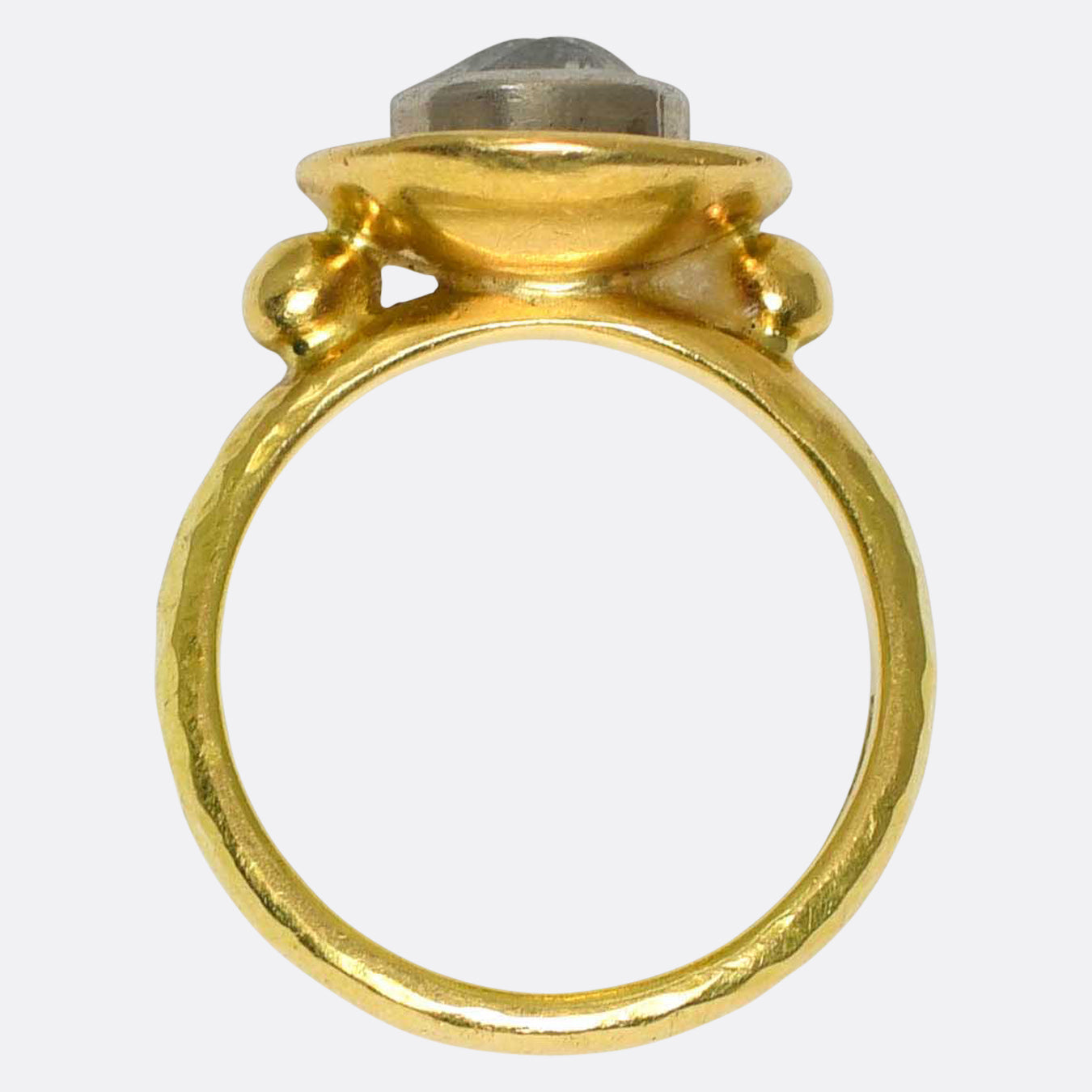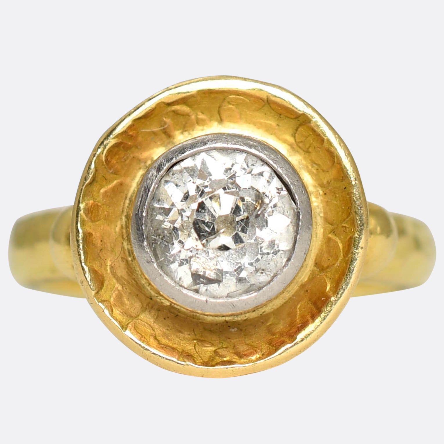 A striking 1.8 carat old mine cut diamond rests at the centre of this buttery yellow gold modernist ring mount. Perfect for unisex wear, the band features English hallmarks for 18 karat gold and the year 1953, and displays an interesting form- a dish shaped head, gold pommel detailed shoulders and a hand hammered band. The diamond is super chunky and bright, and its gorgeous cut makes it sparkle when moved in the natural light. A bold and substantial statement piece; of cool design and of a high quality.