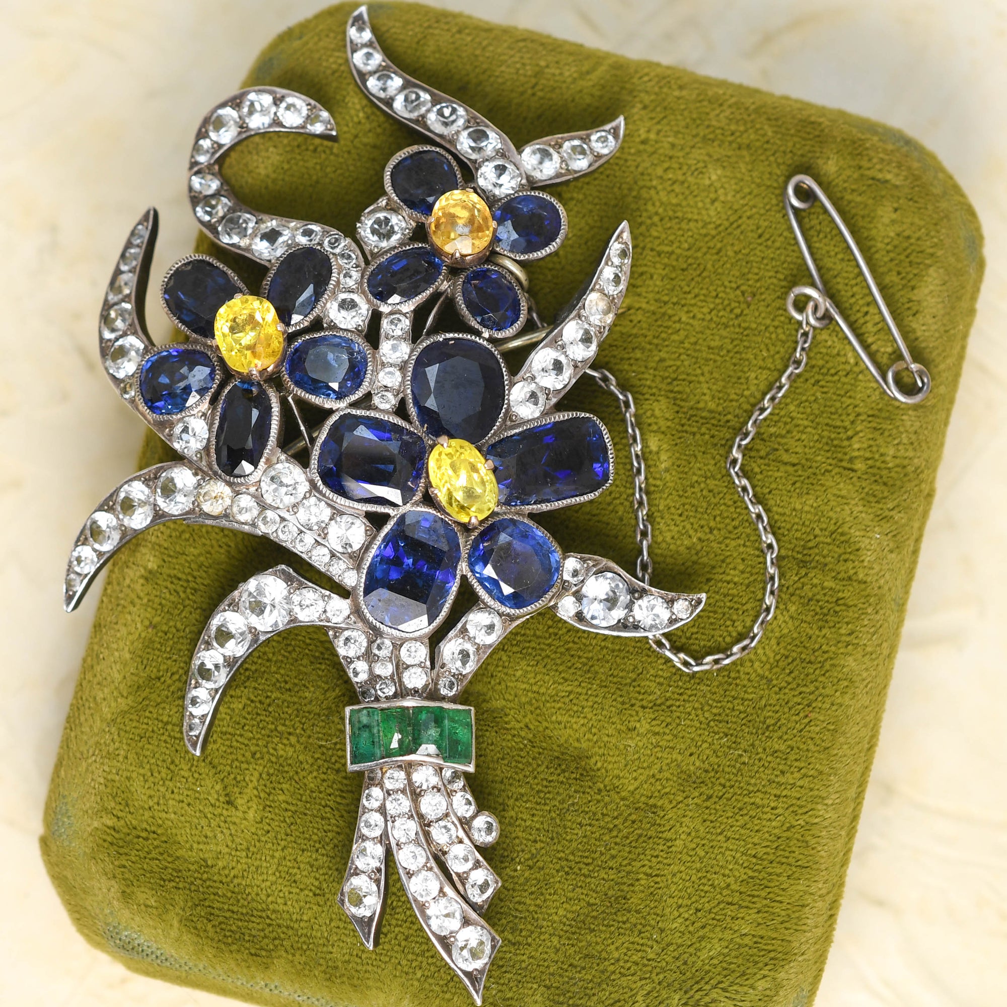 A particularly high quality brooch dating to the turn of the century, circa 1900. Its set with the most amazing sapphires, originating from old Ceylon (Sri Lanka) - yellow, white and blue, with the addition of vibrant green emeralds. Its modelled as a flower spray bouquet, crafted silver throughout. A great pop of gemmy colour.
