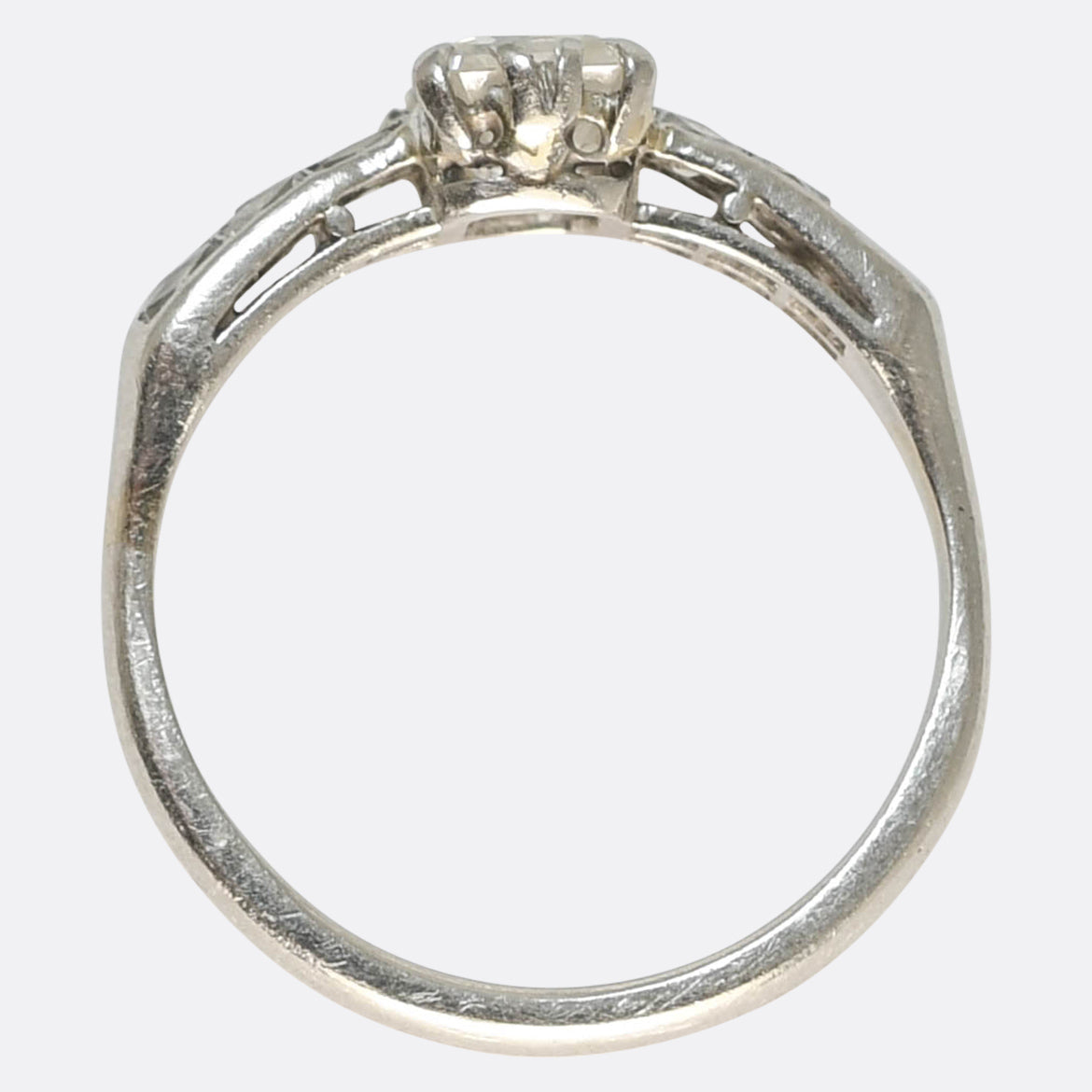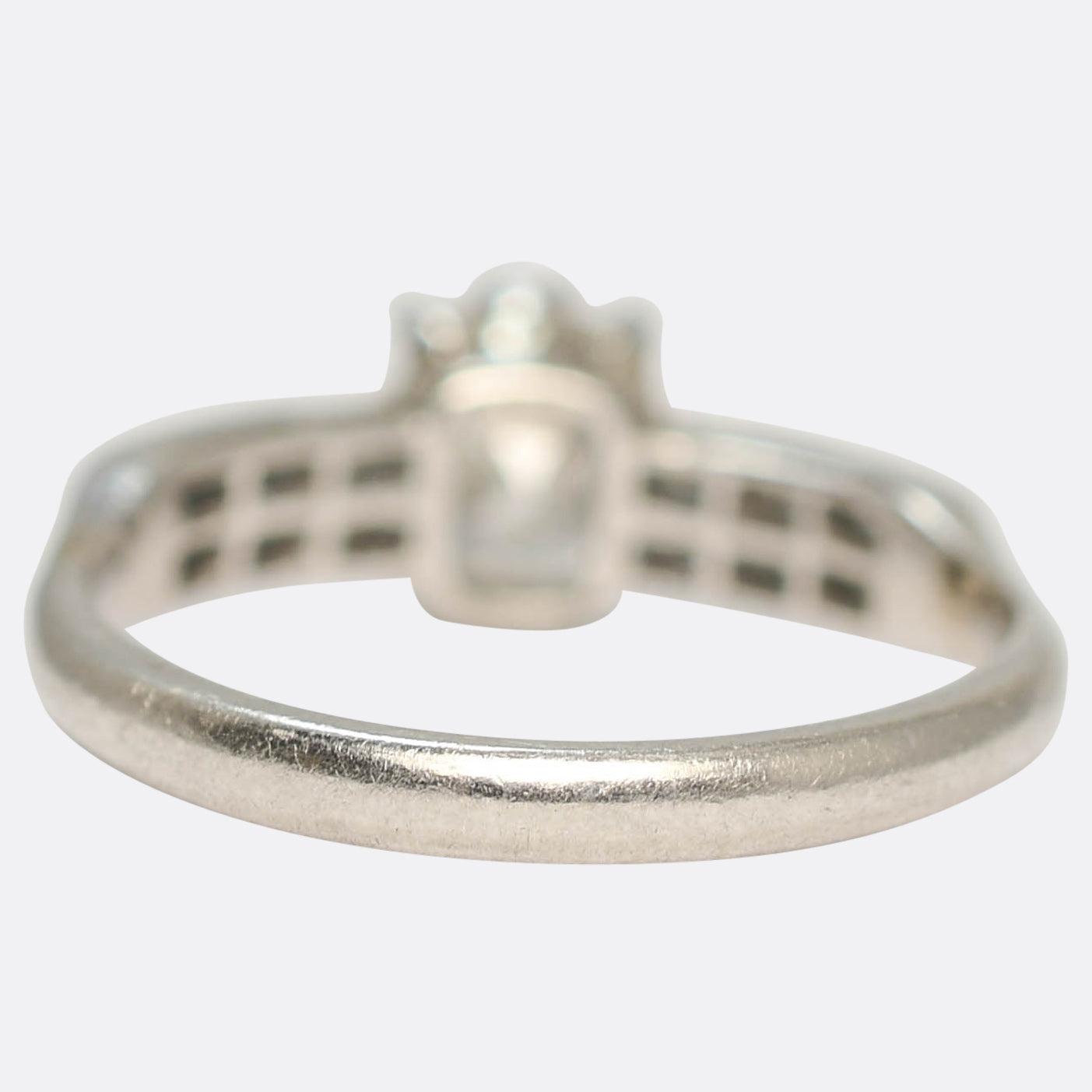 A super romantic antique ring, set with a 0.85ct asscher cut diamond, and flanked by elongated rose and baguette cut diamonds to the shoulders. The centre stone is full of sparkle and shines brilliantly in any light. It a gorgeous centre piece, clean and bright, perfectly matched by the bright platinum band. The shoulders are set with the mixed cut of diamonds, and it rests beautifully against the finger - perfect for an engagement ring! Dates to circa 1915.