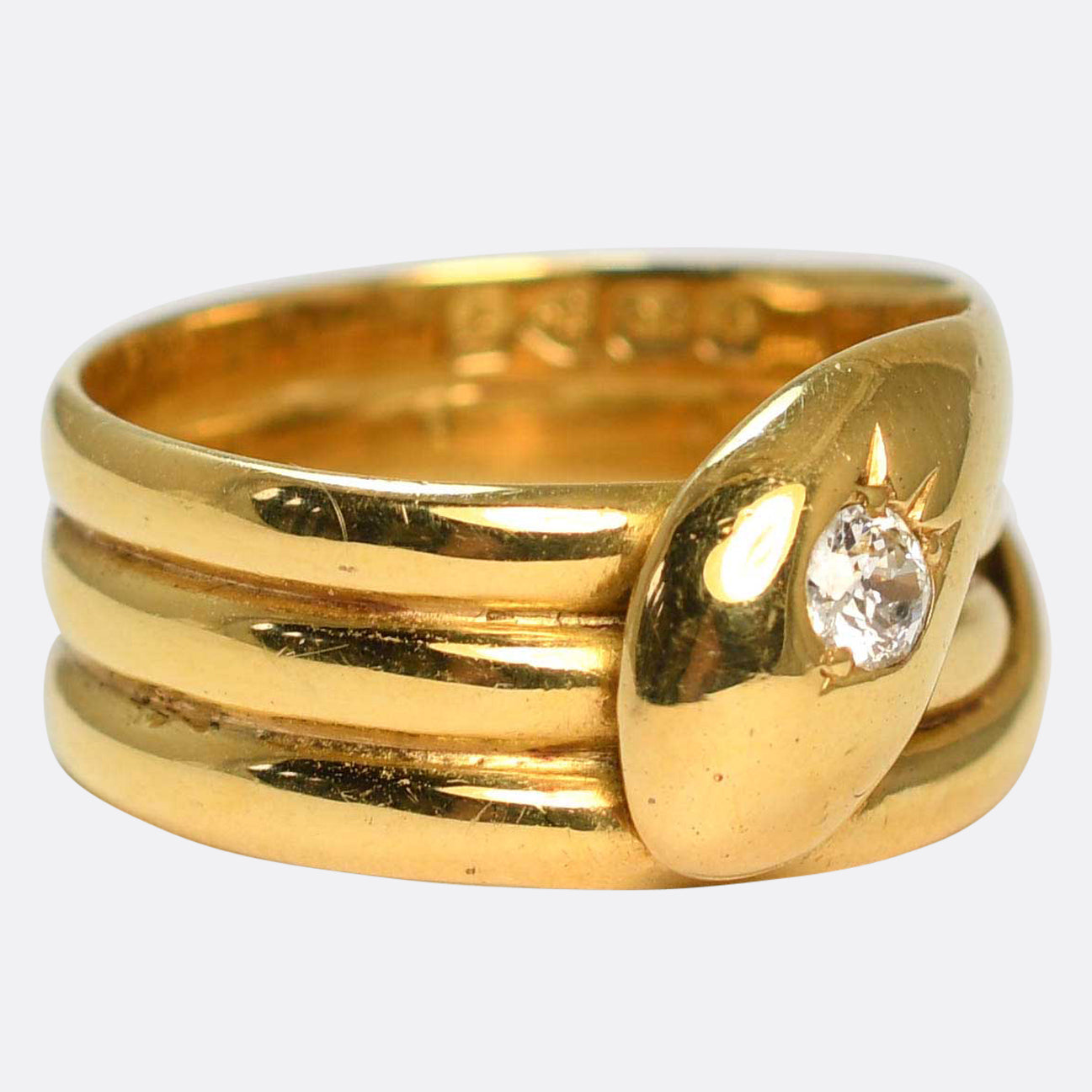 This antique piece is a stunning example of the snake/serpent ring. Modelled in 18 karat gold throughout, it features English hallmarks dating it to the year 1919. This one is lovely and chunky, and the snake wraps around your finger three whole times, and its head and tail meet in the centre. Its head is set with an old cut diamond "brain", and it displays great sparkle within its detailed setting. Historically, the serpent/snake has been a potent symbol of fertility, and, through the periodical shedding of their skin, represent re-birth, immortality, and healing- but they also look pretty badass.