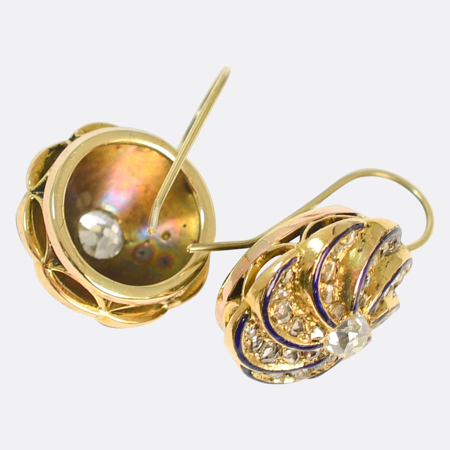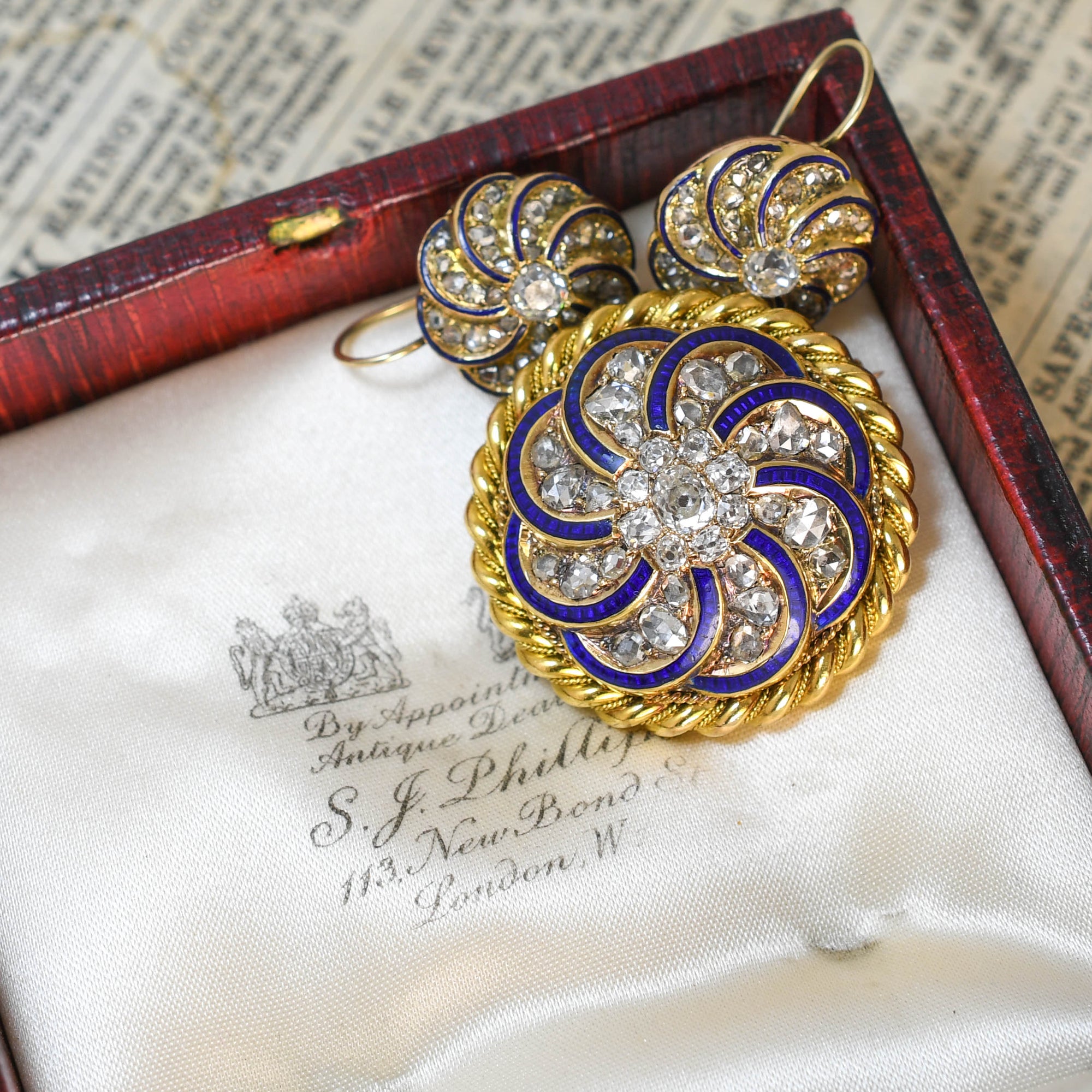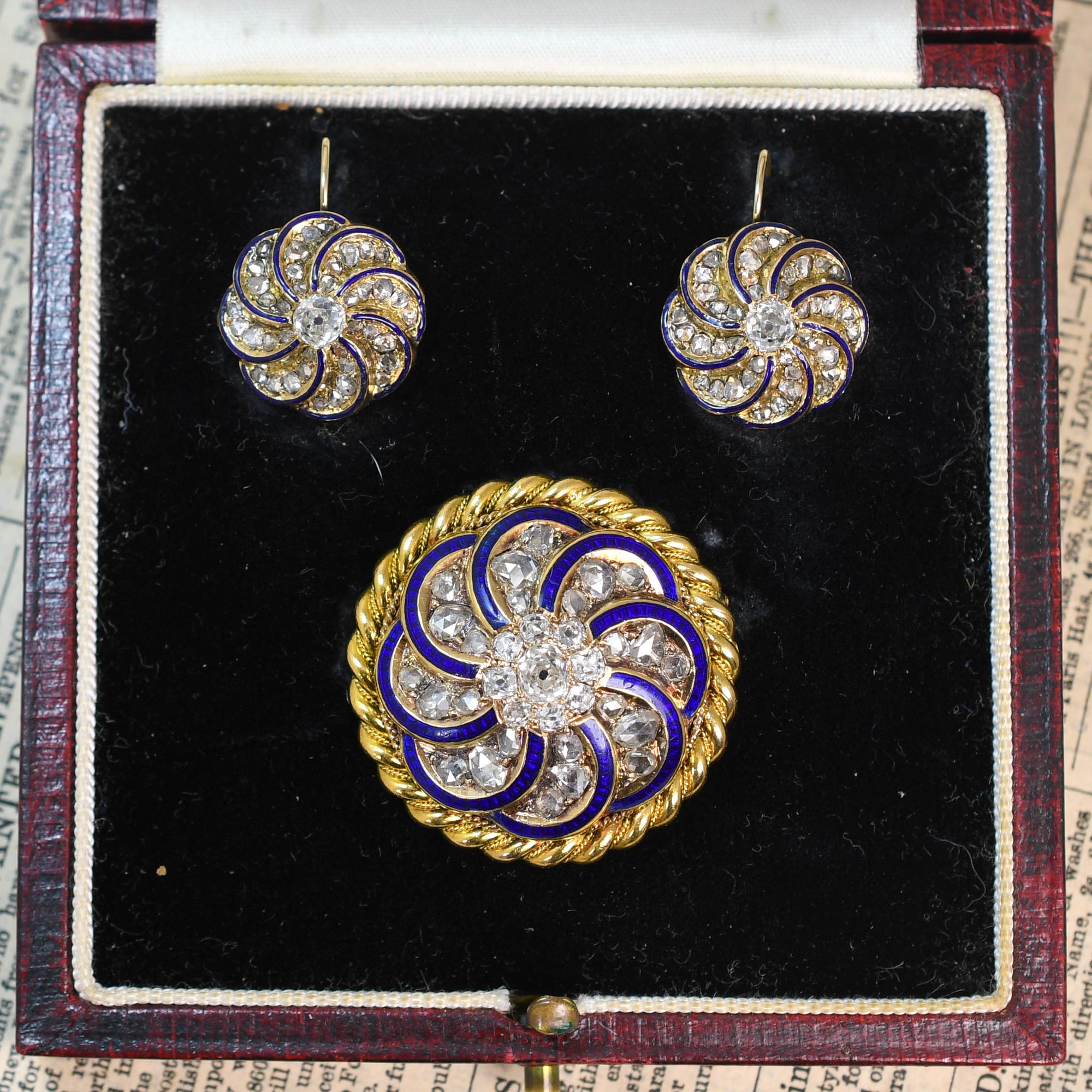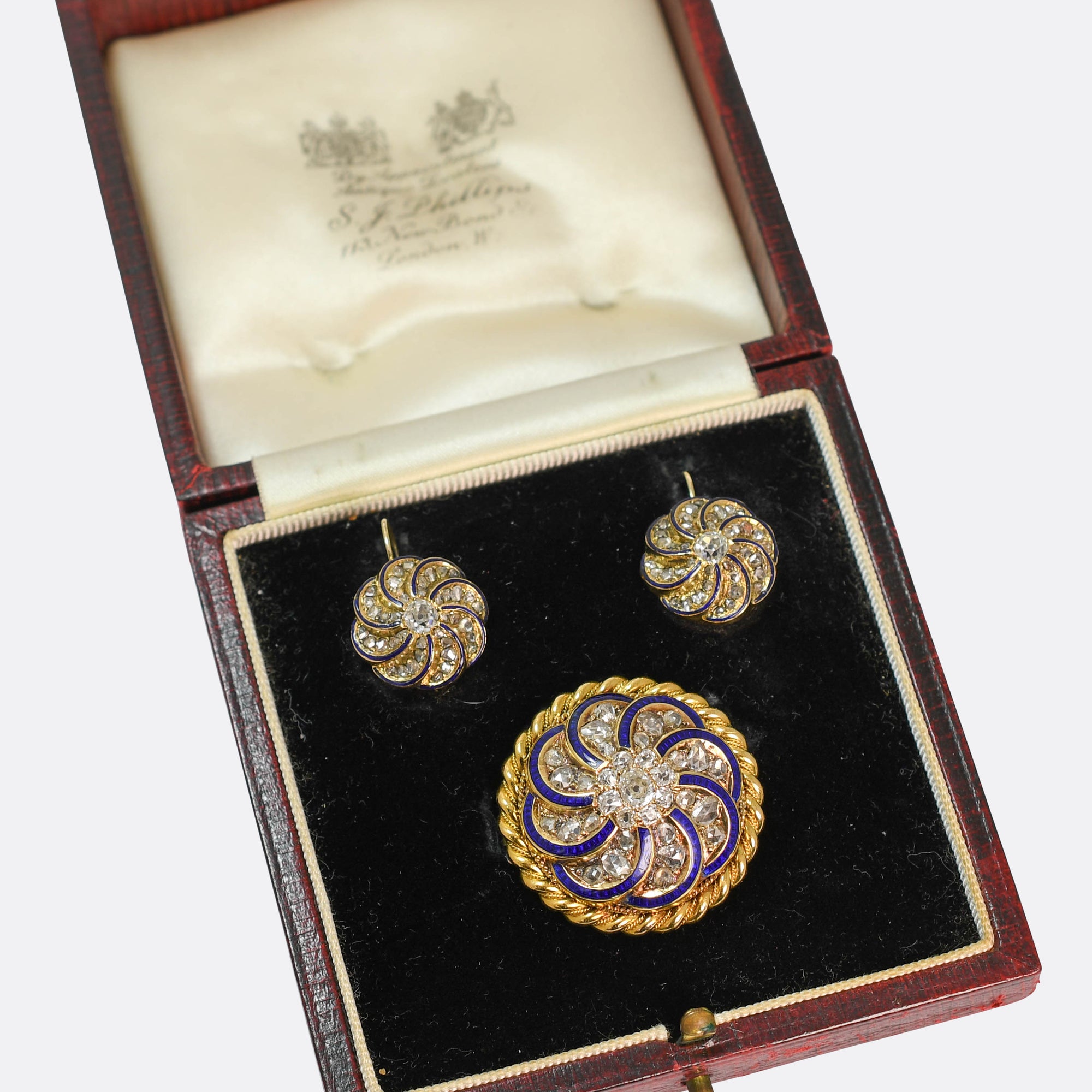 This stunning antique set (or Demi-Parure) dates from the Late Victorian period, circa 1900 and comes boxed with an original S.J. Phillips box, which the piece would have been later retailed. It consist of two pieces - a brooch and a pair of earrings- each one set with fine blue enamel, old mine cut diamonds and gorgeous gold work. The brooch features a lovely border surround of ropework, and the centre is modelled as a type of flower, swirling in one direction and set with rose cut diamond petals and and old cut centre. The earrings are of the same design, with open worked gallery's and slim gold wires. Both pieces are crafted in 15 karat gold, and remain in lovely antique condition.