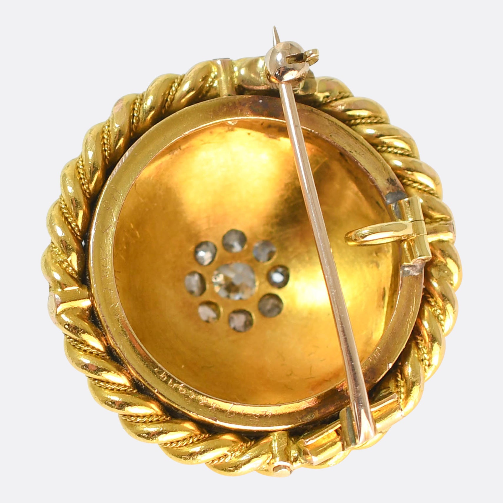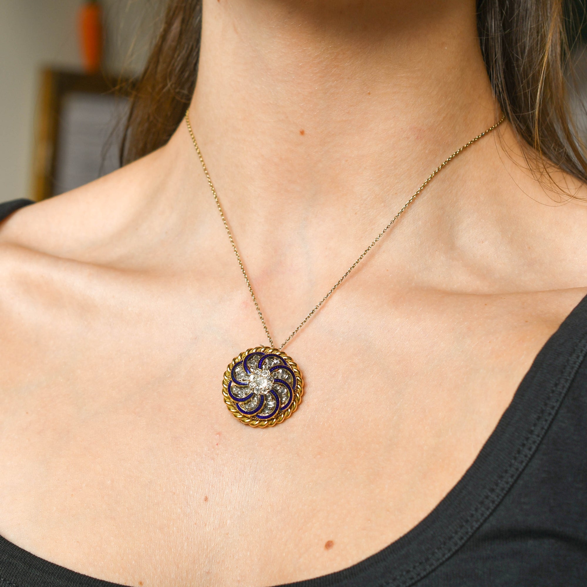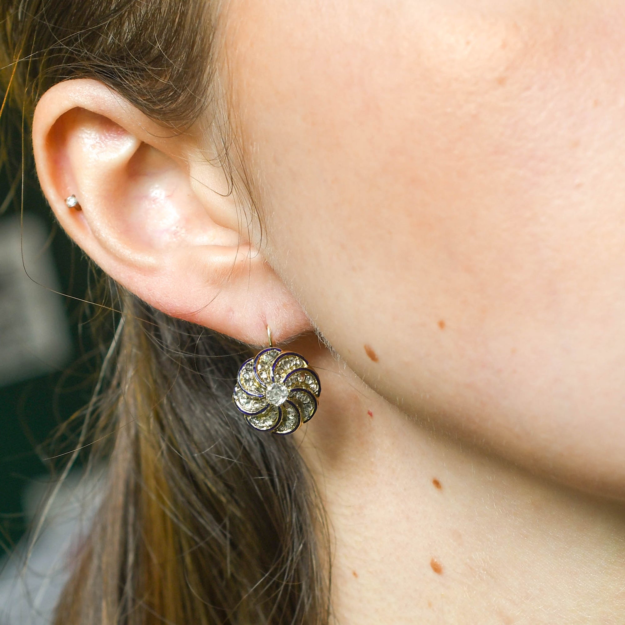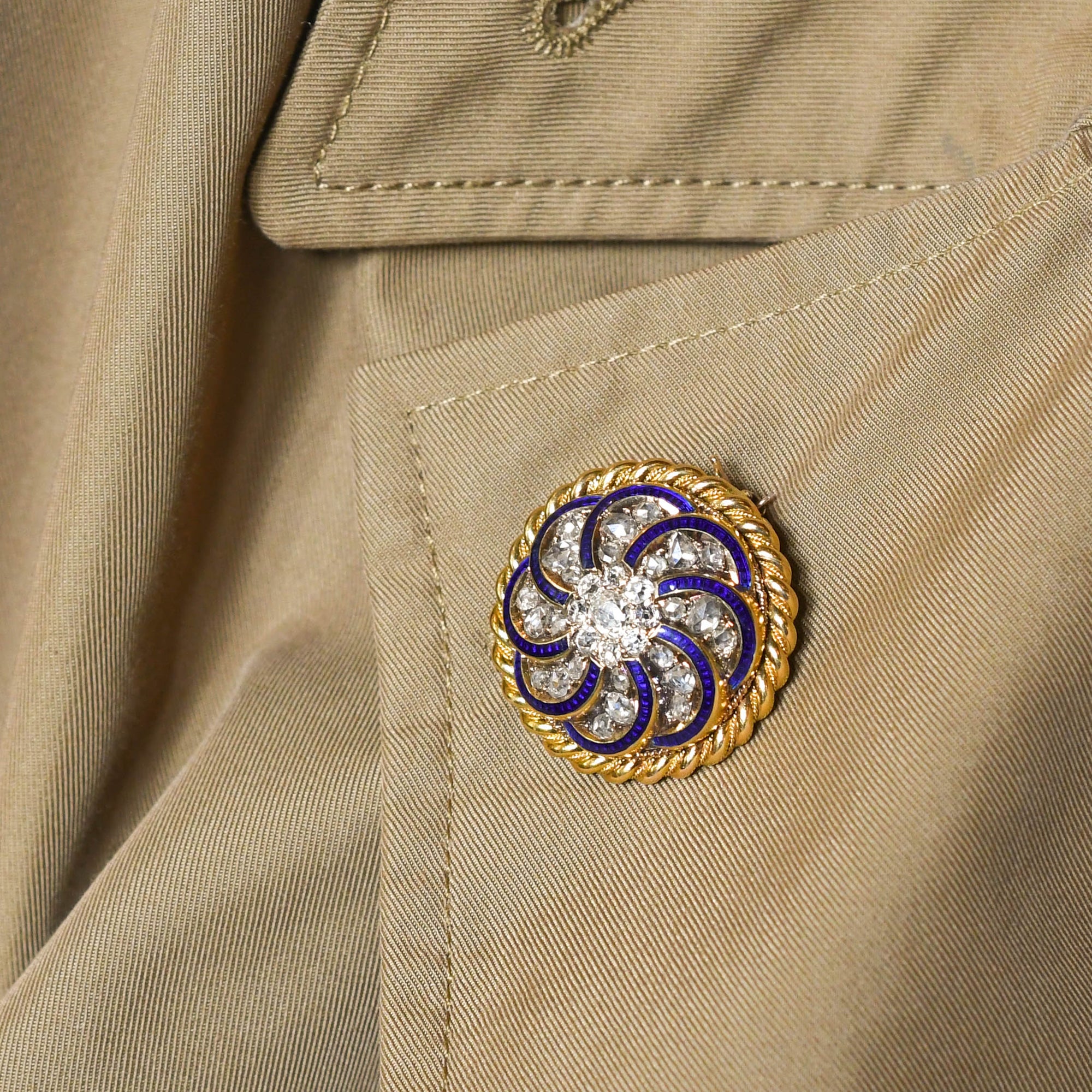 This stunning antique set (or Demi-Parure) dates from the Late Victorian period, circa 1900 and comes boxed with an original S.J. Phillips box, which the piece would have been later retailed. It consist of two pieces - a brooch and a pair of earrings- each one set with fine blue enamel, old mine cut diamonds and gorgeous gold work. The brooch features a lovely border surround of ropework, and the centre is modelled as a type of flower, swirling in one direction and set with rose cut diamond petals and and old cut centre. The earrings are of the same design, with open worked gallery's and slim gold wires. Both pieces are crafted in 15 karat gold, and remain in lovely antique condition.