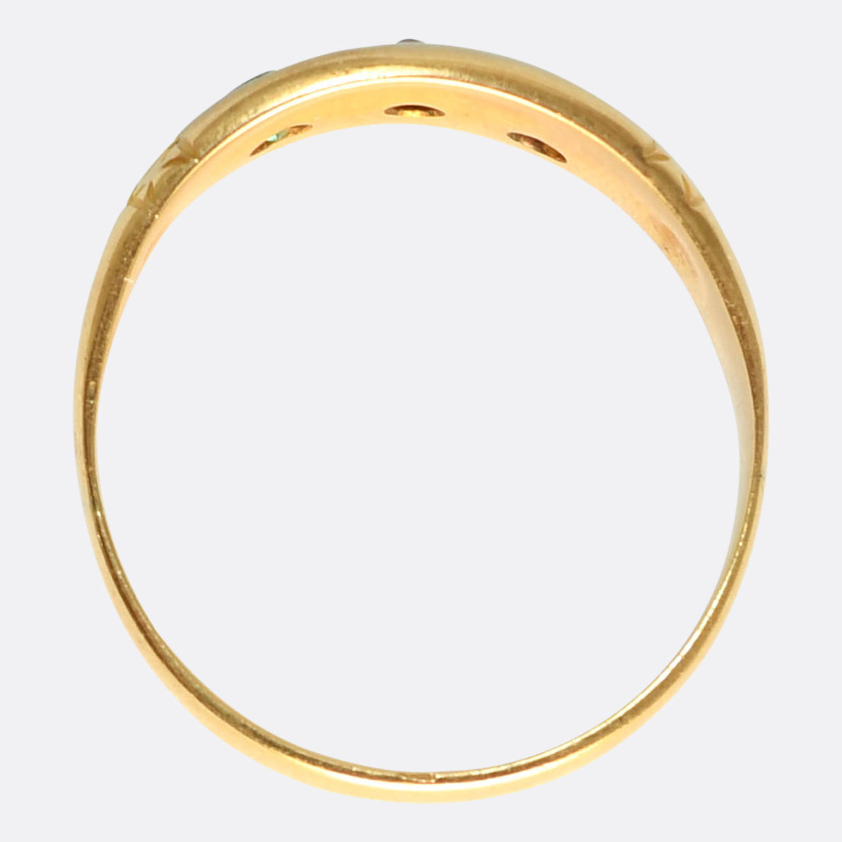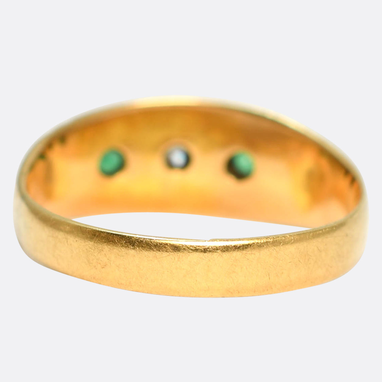 A charming antique gypsy ring set with an old cut diamond centre, flanked by two star-set emeralds and small engraved details. The band rests low against the finger, and it features clear marks confirming its modelled buttery 18 karat gold. It dates to the turn of the century, circa 1900, and the combination of green, gold and white is fantastic!