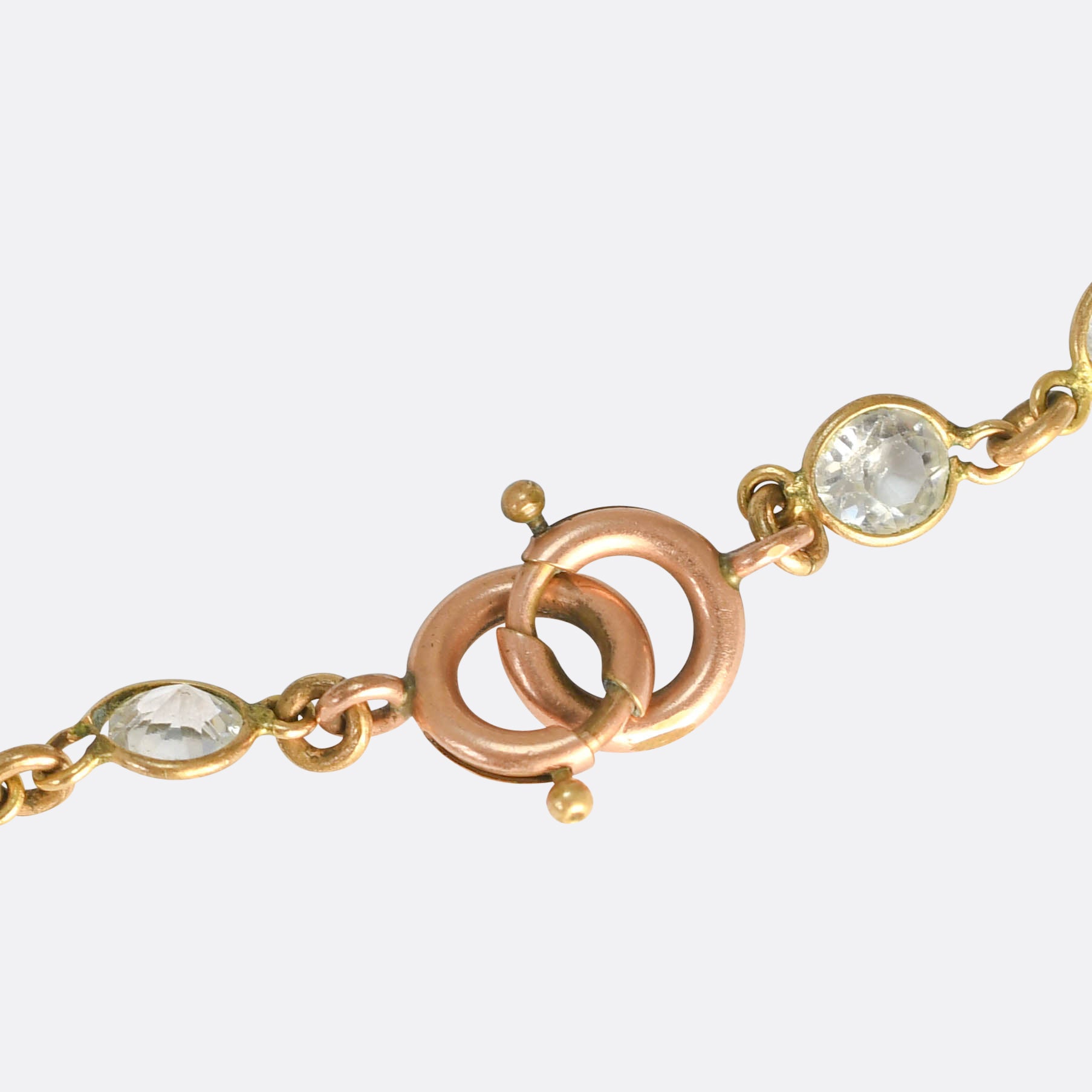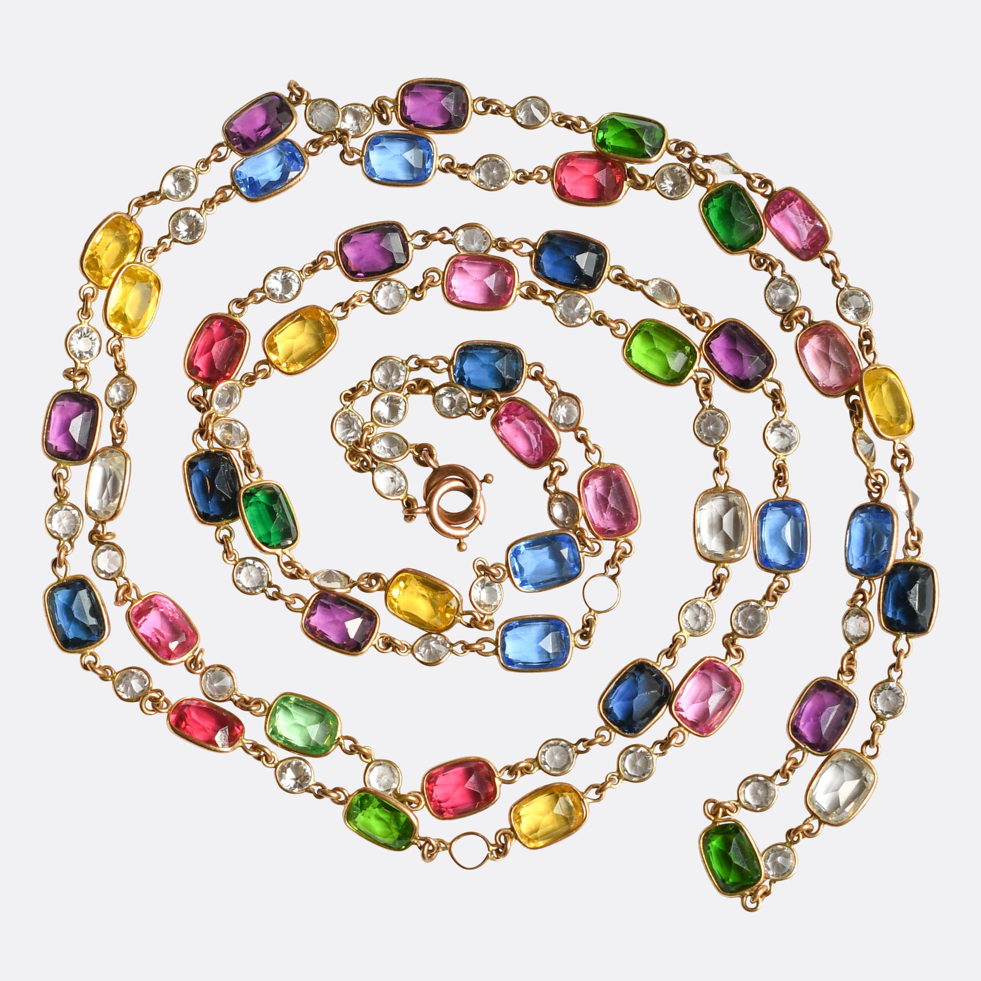 This colourful antique harlequin long chain is set with a rainbow spectrum of paste stones- white, pink, yellow, blue, green, purple and red. Dating from the turn of the century, circa 1900, it has a wearable length of 56 inches!! It can be worn long, doubled or tripled, and fastens with two bolt rings- How will you wear it? The paste stones are well saturated, and are perfectly complemented by the yellow metal chain.