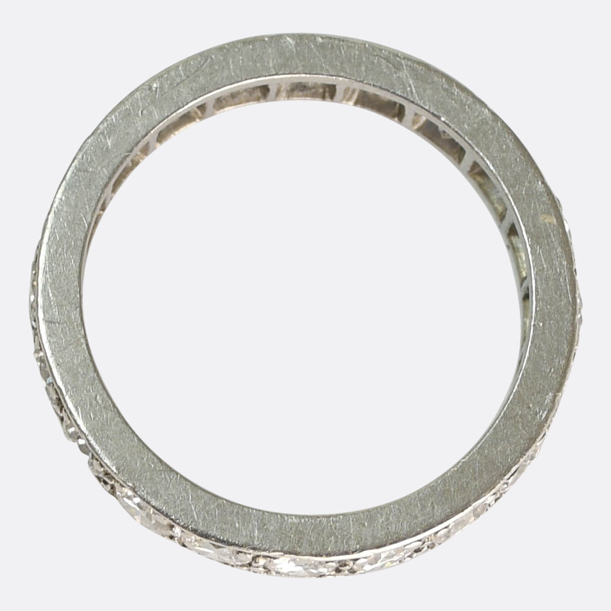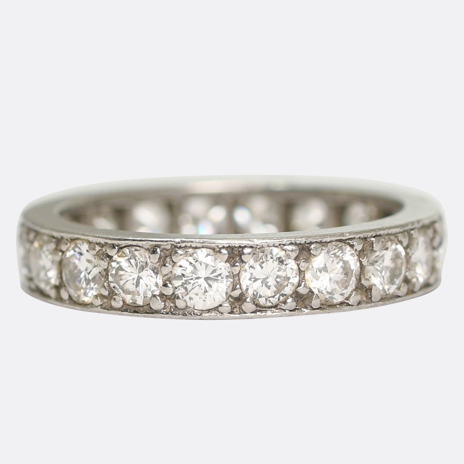 A charming Eternity Ring dating from the Art Deco period. It's set with twenty sparkling brilliant cut diamonds - 0.10ct each - giving it a weight of 2 carats total! Lovely detailing surrounds the stones, and its crafted platinum throughout. The band is a great size and width, and it fits a US 5.5 finger. The concept of an eternity ring can be traced back 4,000 years to the ancient Egyptians, who were said to offer them as a token of both eternal love and life- Making them perfect for stacking and wedding bands!