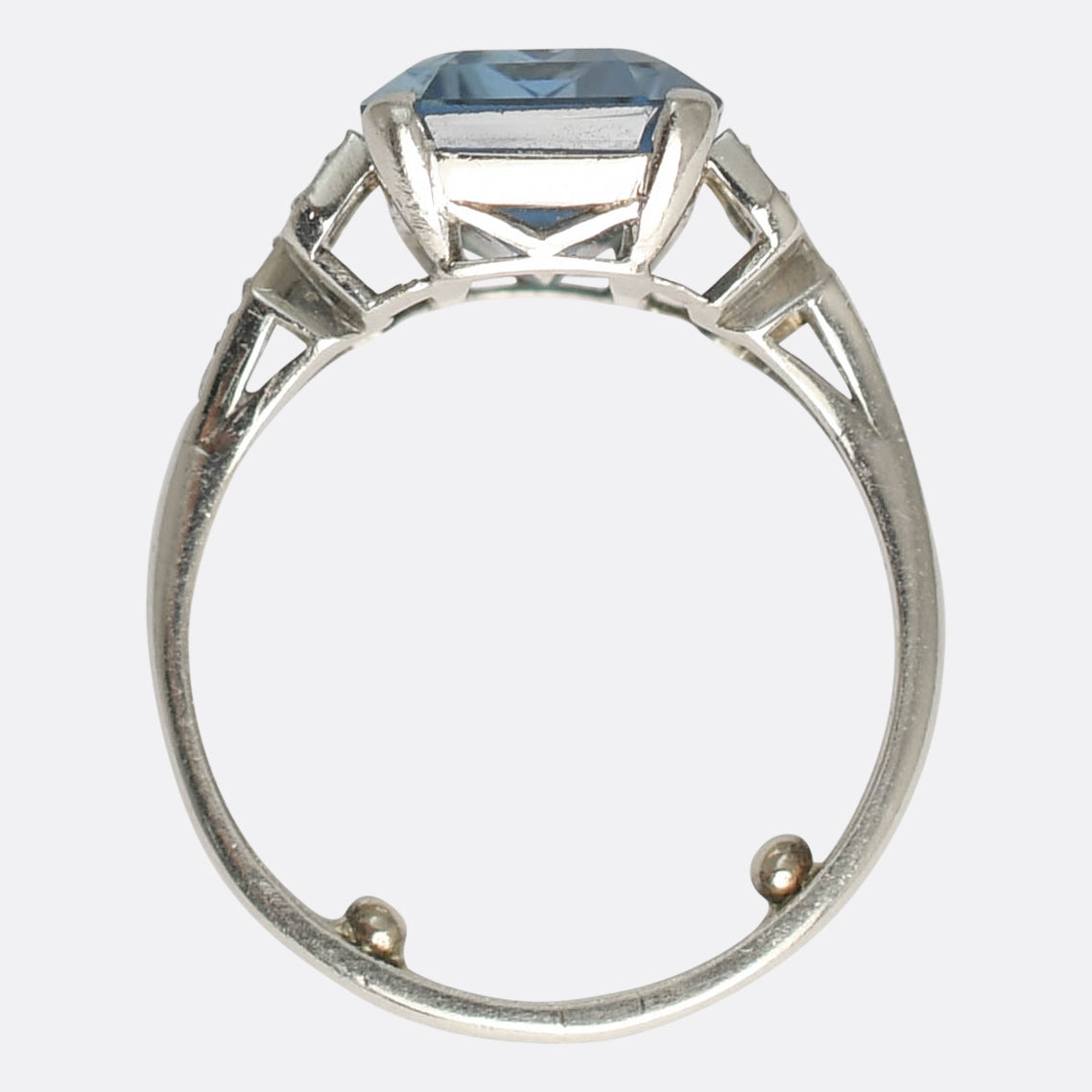 An amazing Art Deco ring set with a fine quality 5.63 carat aquamarine. Its gorgeous cut presents the stones' colour perfectly... You could say it displays that "Santa Maria" colour- a rare medium toned, highly saturated colour. It shows a transparent appearance, and the light reflects from the stone beautifully when moved around on the finger. Its set in platinum with geometric set transitional cut diamonds at each shoulder, each stone surrounded by fine millegrain detailing. The band is slim while the gallery is open worked, and it remains in a gorgeous antique condition.