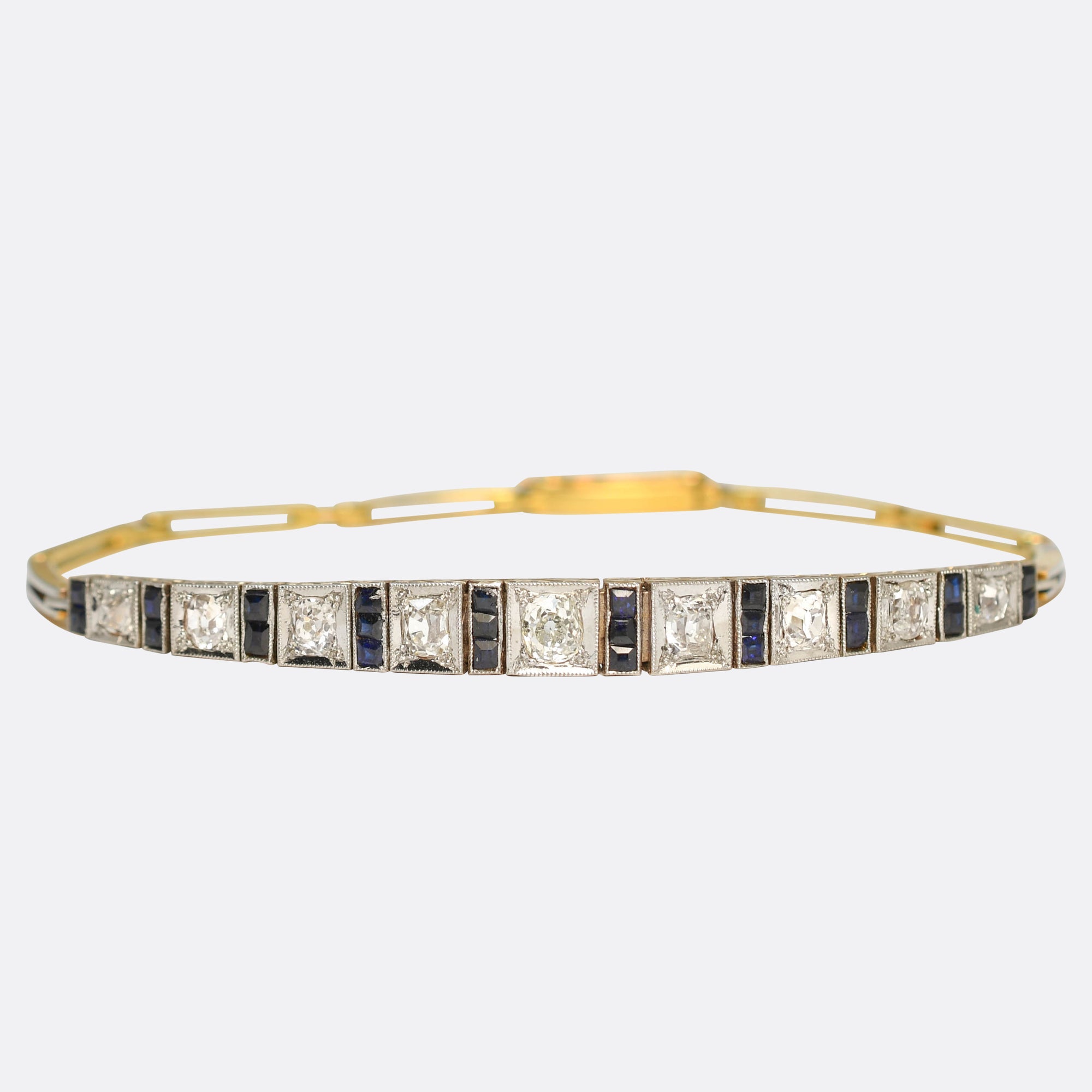 A beautiful Art Deco bracelet set with diamonds and sapphires. It's modelled in platinum and 18k yellow gold, with fine millegrain settings and lovely hand-chased embellishment to the sides. Each of the millegrain segments are set with chunky old mine cut diamonds and natural blue sapphires, and its individually articulated so the bracelet can conform to the shape of the wrist. It dates from the 1920s, comes complete with a fitted box and remains in excellent condition. 6.3 inches wearable length.