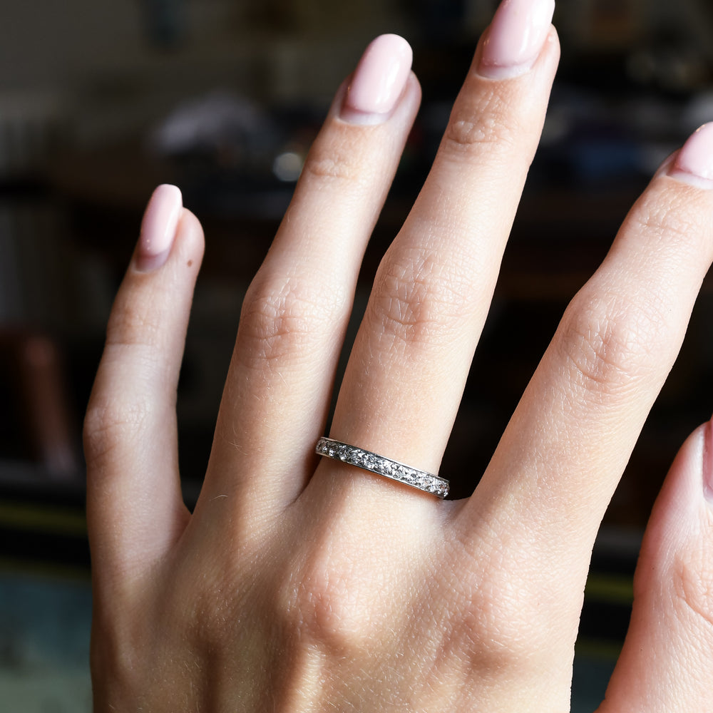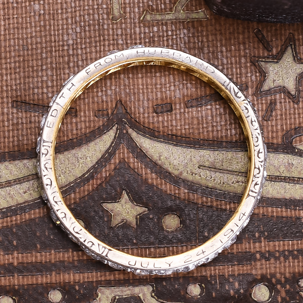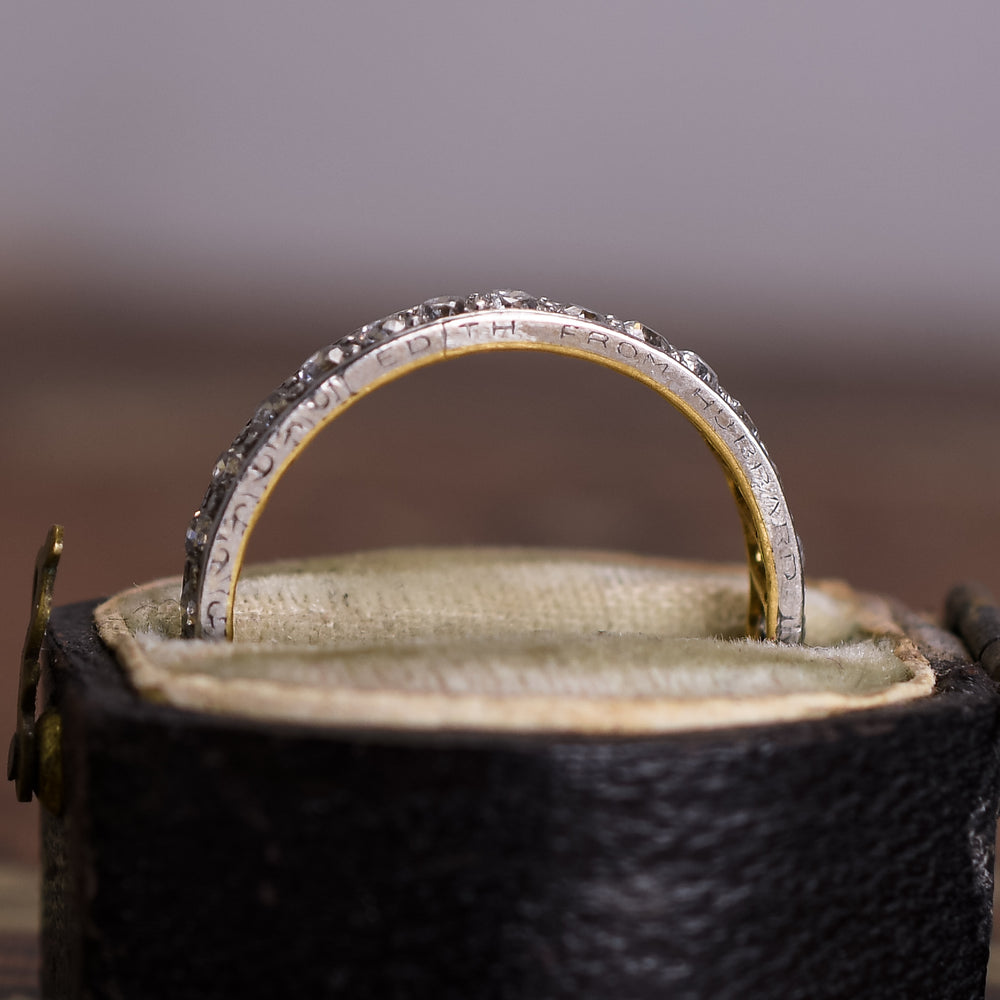 A stunning eternity ring, with the words "Edith from Hubbard, July 24 1914" on the edge of the band, a sweet and simple sentiment, from a husband to wife. Maybe a wedding band, anniversary gift? Who knows... It's set with sparkly old cut diamonds with tiny detailing to the other side of the band. It's crafted in 15k gold with platinum settings, and fits a 8.7 finger.