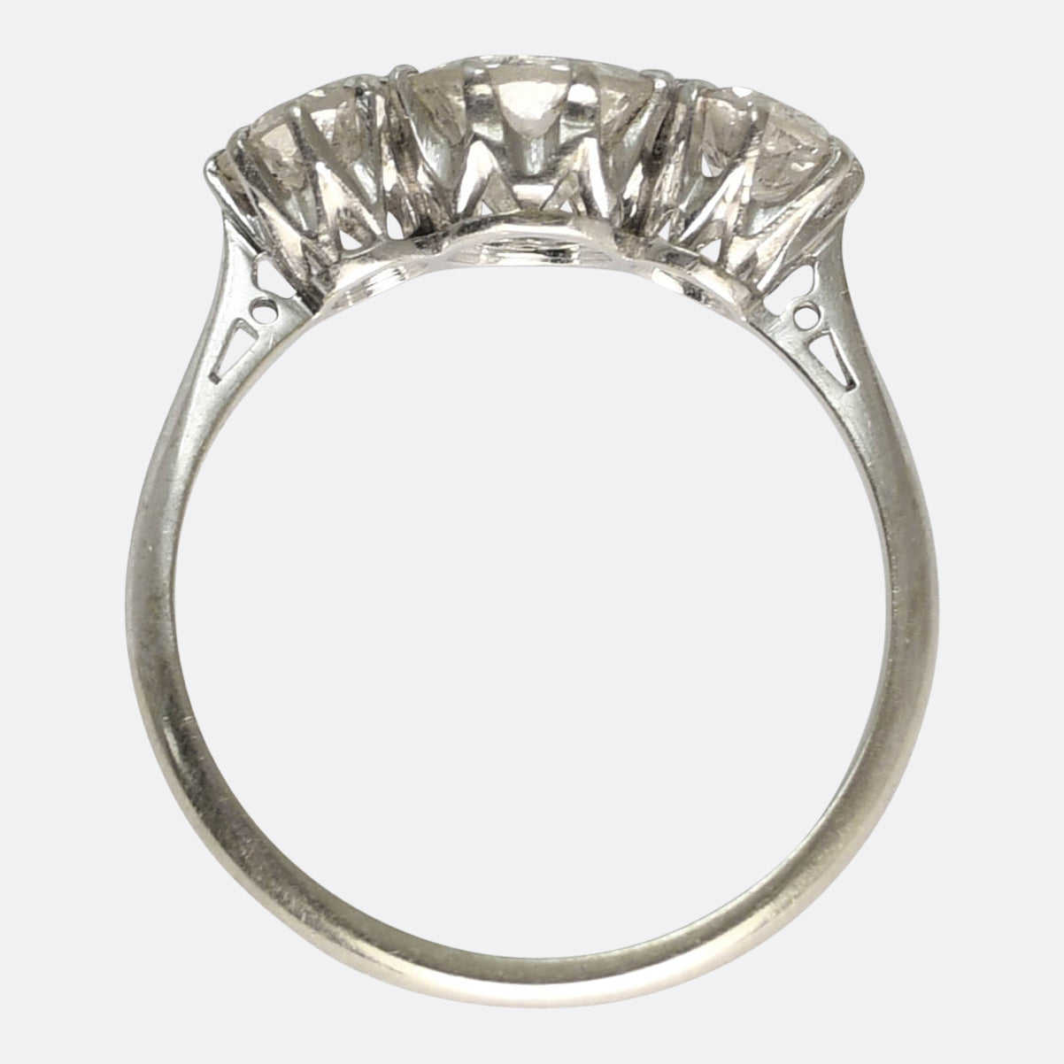 A stunning Art Deco period three-stone/trilogy ring. It's set with three transitional cut diamonds, totalling at 1.56 carats, and they rest in pretty platinum claw mounts. With gorgeous pierced details to the gallery, the band features subtly pinched shoulders- modelled in 18 karat white gold. It features marks to the inner band for A.W. Crosbee & Sons Ltd, Birmingham based jewellers founded in 1902. They specialised in platinum diamond rings and other gem-set rings.