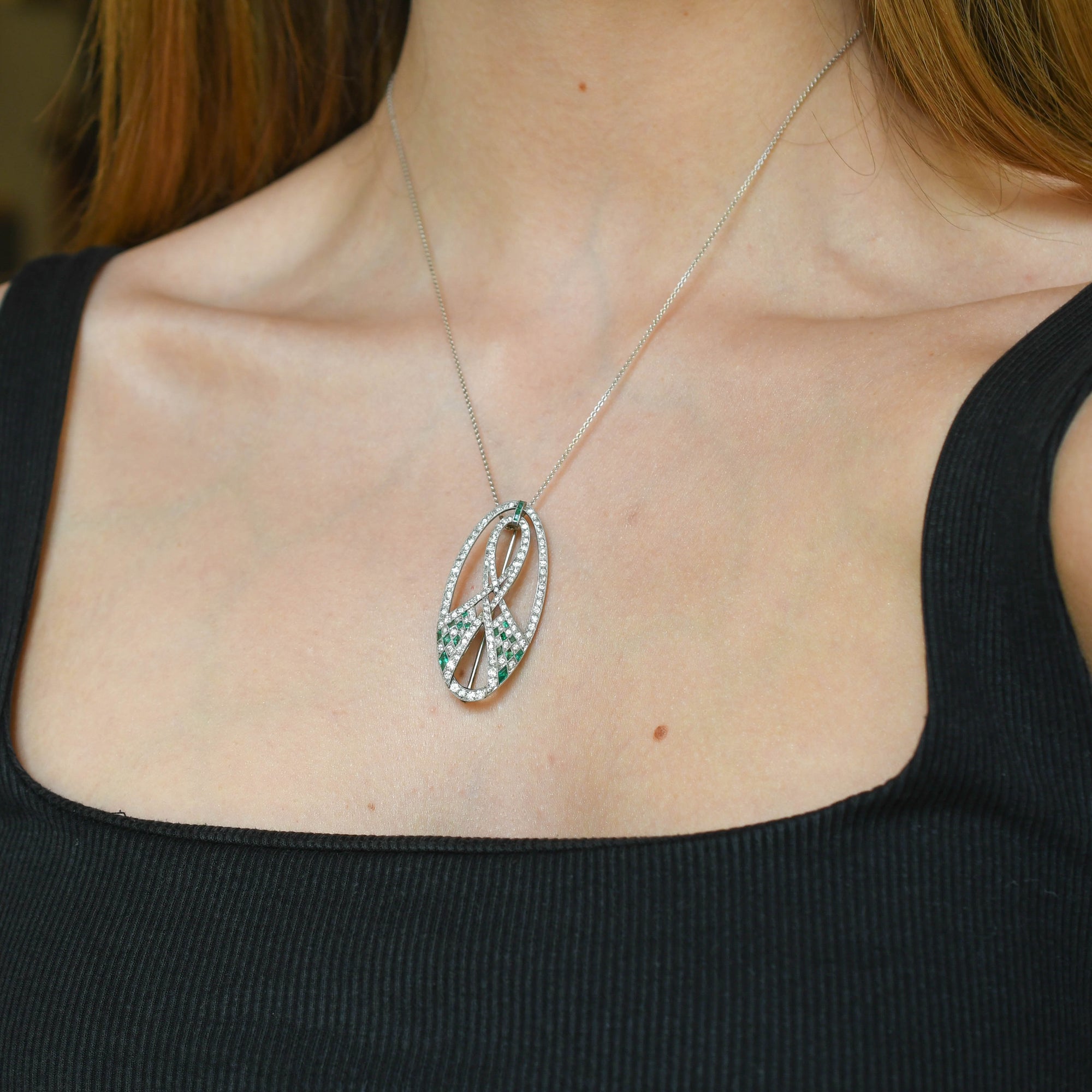 A stunning antique brooch dating from the Art Deco period, circa 1920. This gorgeous piece features gorgeous platinum and diamond set openwork arranged around a central emerald and diamond set ribbon motif. The design features swooping design, sharp angles from the square set stones and bold lines. The whole piece is finished in platinum throughout, and its design gives it that striking yet delicate feel. You could possibly gift this to someone who may associate with the ribbon of awareness <3.