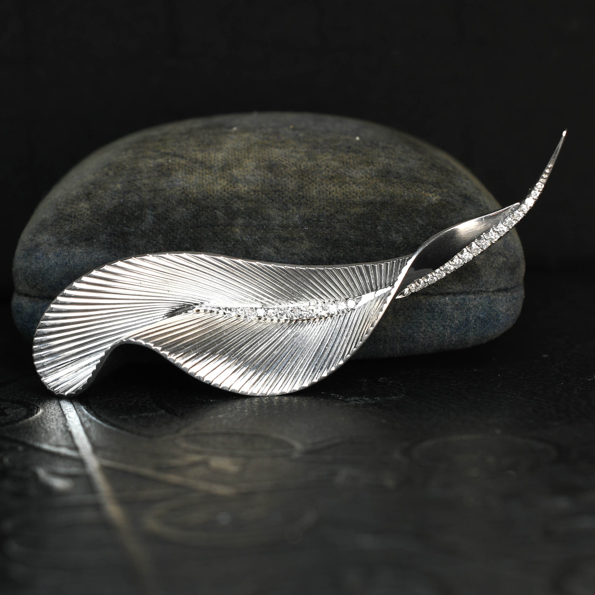 An utterly stunning antique feather brooch/pin, French made and dating from the Art Deco period, circa 1930. Its set with a single row of icy diamond that runs down the centre of the feather, whilst gorgeous platinum work create the twisted "feather" shape. It features French marks to the back (for platinum and 18k gold), and it features two pins for wear on your jacket collar. Wear this gorgeous piece as a symbol of freedom, beauty and grace.