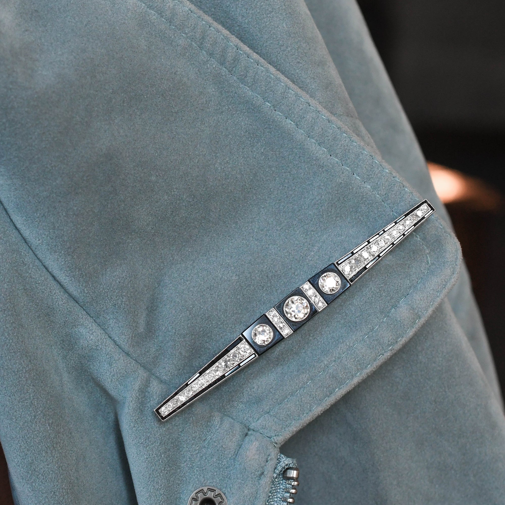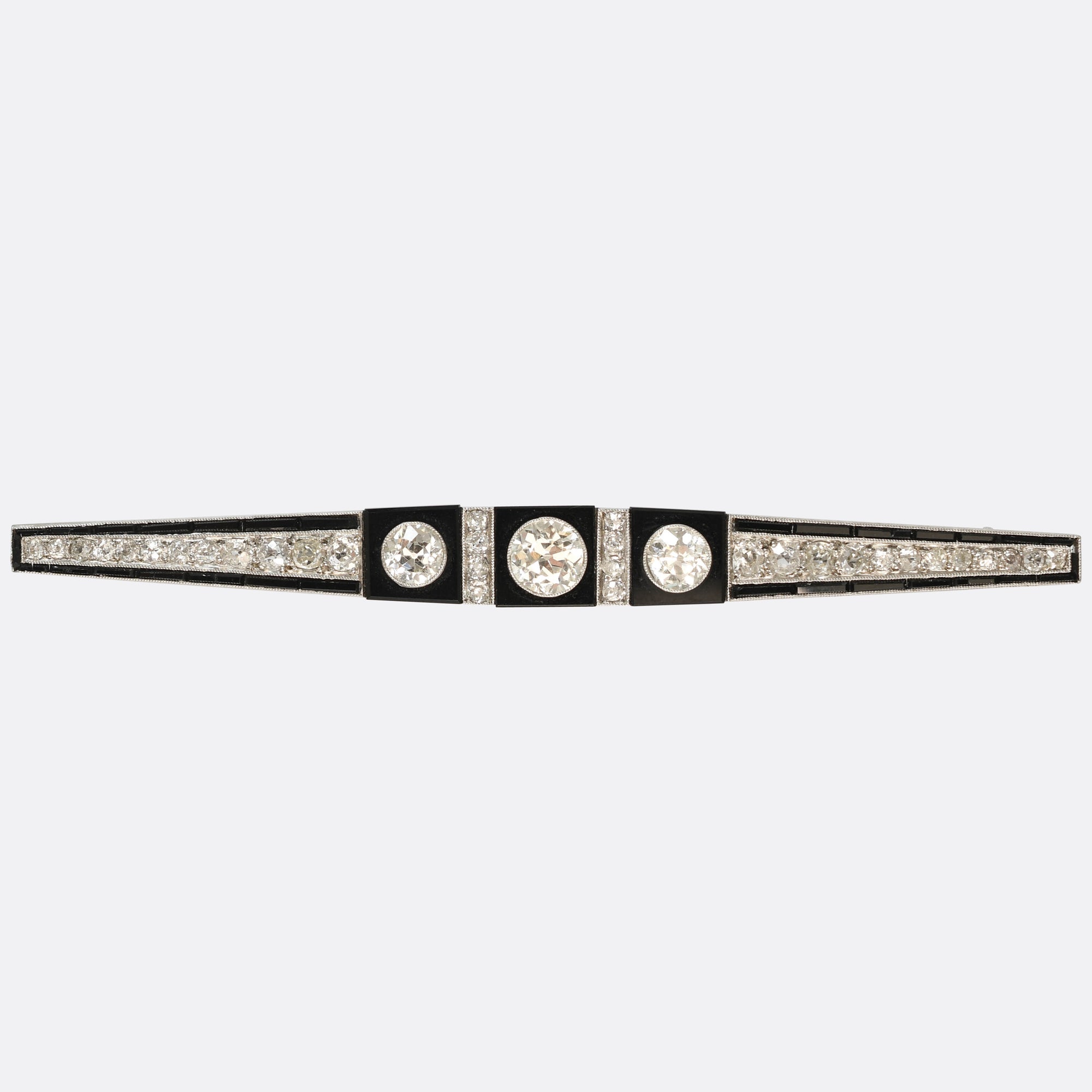 This striking antique bar brooch dates from the Art Deco period, circa 1920. Set across the bar are three square shaped onyx panels, set with three old cut diamonds (2.40ct total) that appear to flat across the top of them, like twinkling stars in the night sky. In-between each panel are single rows of diamonds amongst platinum millegrain. At either side, horizontal rows of diamonds are set with onyx borders, and it features lovely scroll detailed sides and open backed settings. Crafted in platinum throughout, it has a total diamond weight of 3.50 carats- and you can wear this on your collar, on a chain or even in your hair!