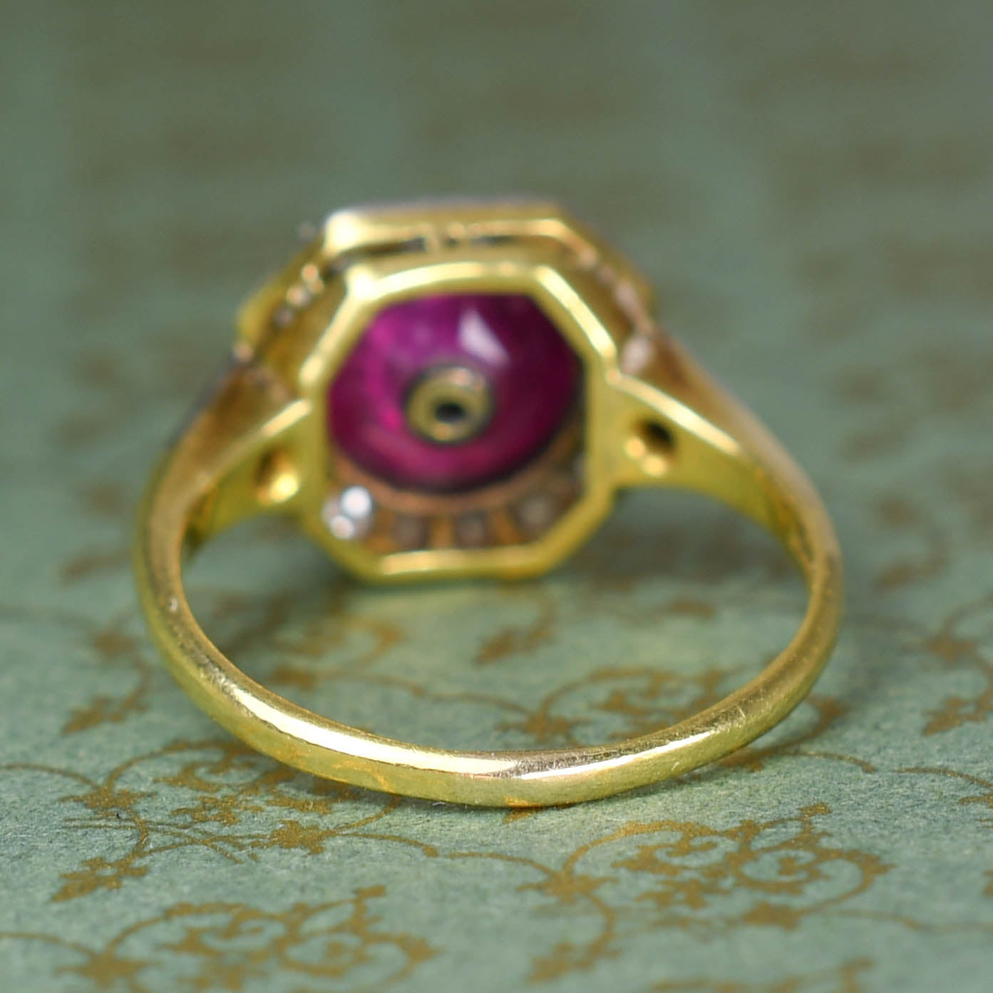 A fantastic antique target ring dating from the Art Deco period, circa 1920. The head is octagonal in shape, set with a central juicy ruby centre. It displays an intense colour and saturation, and "floating" in the centre is a platinum millegrain set 11pt old cut diamond. Surrounding the ruby, is a lovely cluster of old cut diamonds, with two rose cut diamond set shoulders. It features a lovely open backed head, allowing the light to shine in through the stones, and the band is modelled in 18 karat yellow gold.