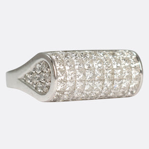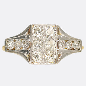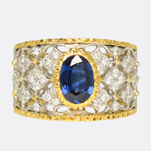 A lovely Art Deco eternity ring set with alternating trios of calibré cut sapphires and diamonds. It dates from the 1920s and is modelled in18k white gold, with beautiful hand-chased detailing to each sides of the band. Fits a 6.75 finger.