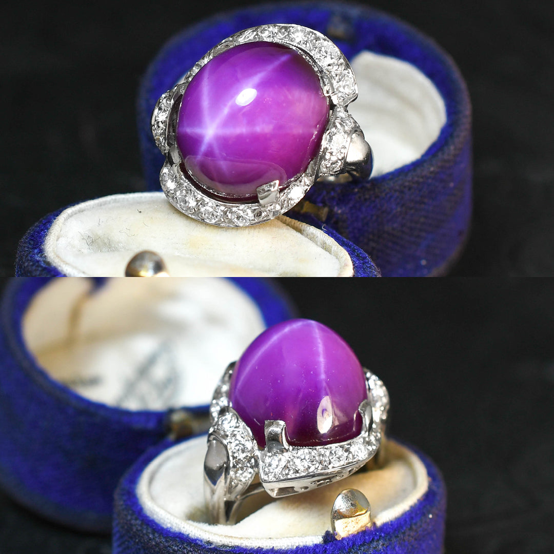 This stunning antique cluster ring is set with a show-stopping central star ruby, surrounded by a halo of bright, brilliant cut diamonds. The ring is particularly beautiful itself, as the lovely cluster follows the shape of the centre stone, creating an unusual shape and flow. The main event, the star ruby, displays excellent asterism: the effect whereby a six pointed star appears to shimmer within the stone. Its modelled in 15k white gold throughout and dates to circa 1930.