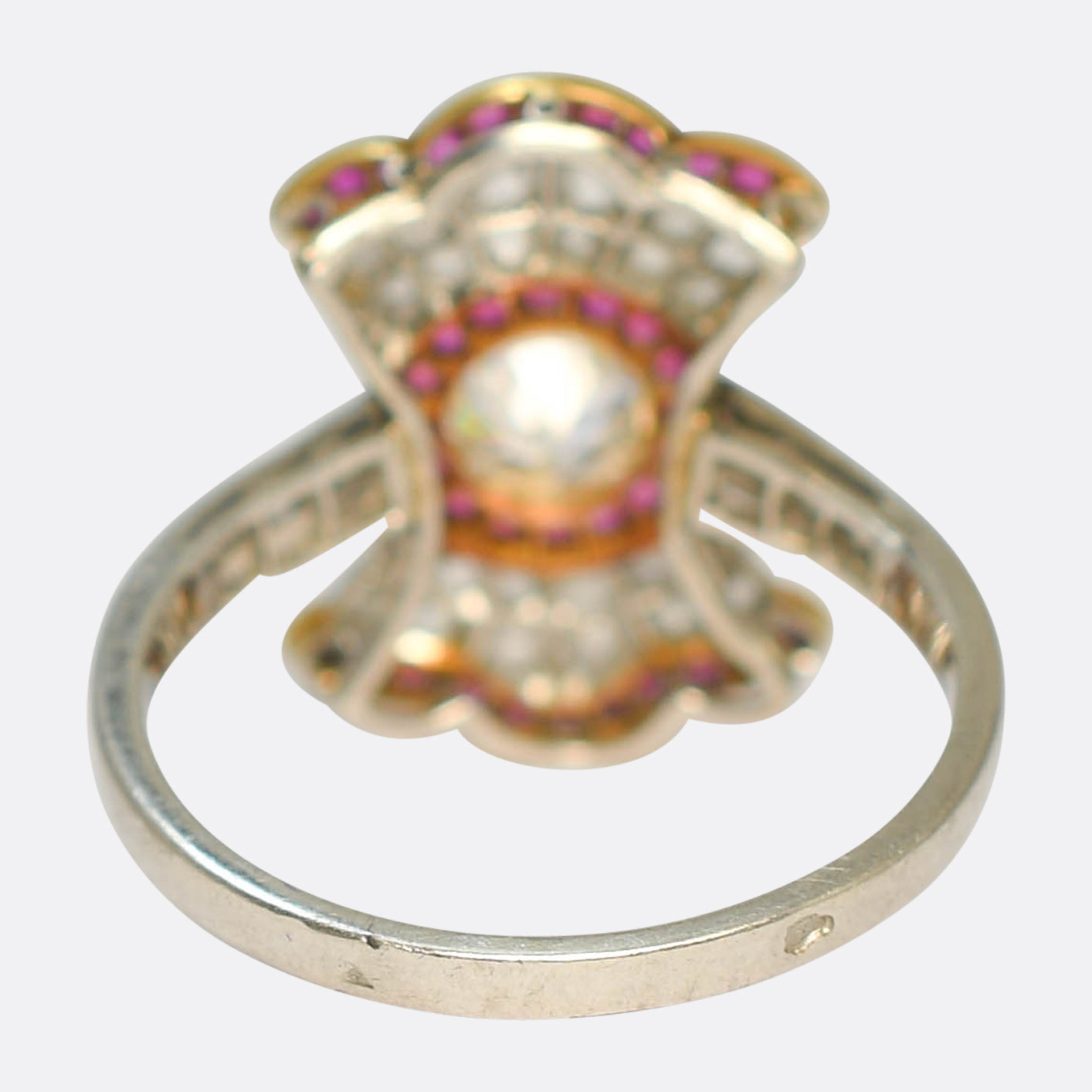 This high quality Belle Époque ring is gorgeous in shape, set with rose and old cut diamonds, with juicy ruby accents. The head is shaped like a charming bow, resting North/South along the finger, and the centre is set with a super bright and sparkly old cut diamond, just over half a carat in weight. Its surrounded by a halo of rubies encased in gorgeous 18k gold millegrain, that sets it apart from the outer sections. Each section of the bow are set with glistening rose cuts with further rubies and millegrain details, and at each side of the head are three rose cuts, leading to the platinum band. A super gorgeous ring, in excellent antique condition with French marks on the outer band.