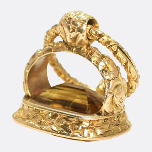 A cool antique compass pendant, dating from the Edwardian period, with English hallmarks for the year 1902. It's crafted in 15k yellow gold throughout, with a black and enamel painted mother of pearl compass face, behind a glass panel. Hand painted are eight compass points, North, South, East, West- you know the rest... The back features an uncarved panel of bloodstone and the piece is tied together perfectly with a continuous knot that tops the piece. Wear this on a gold chain, pointing you in the right direction, and if you've lost your way, this is sure to help.