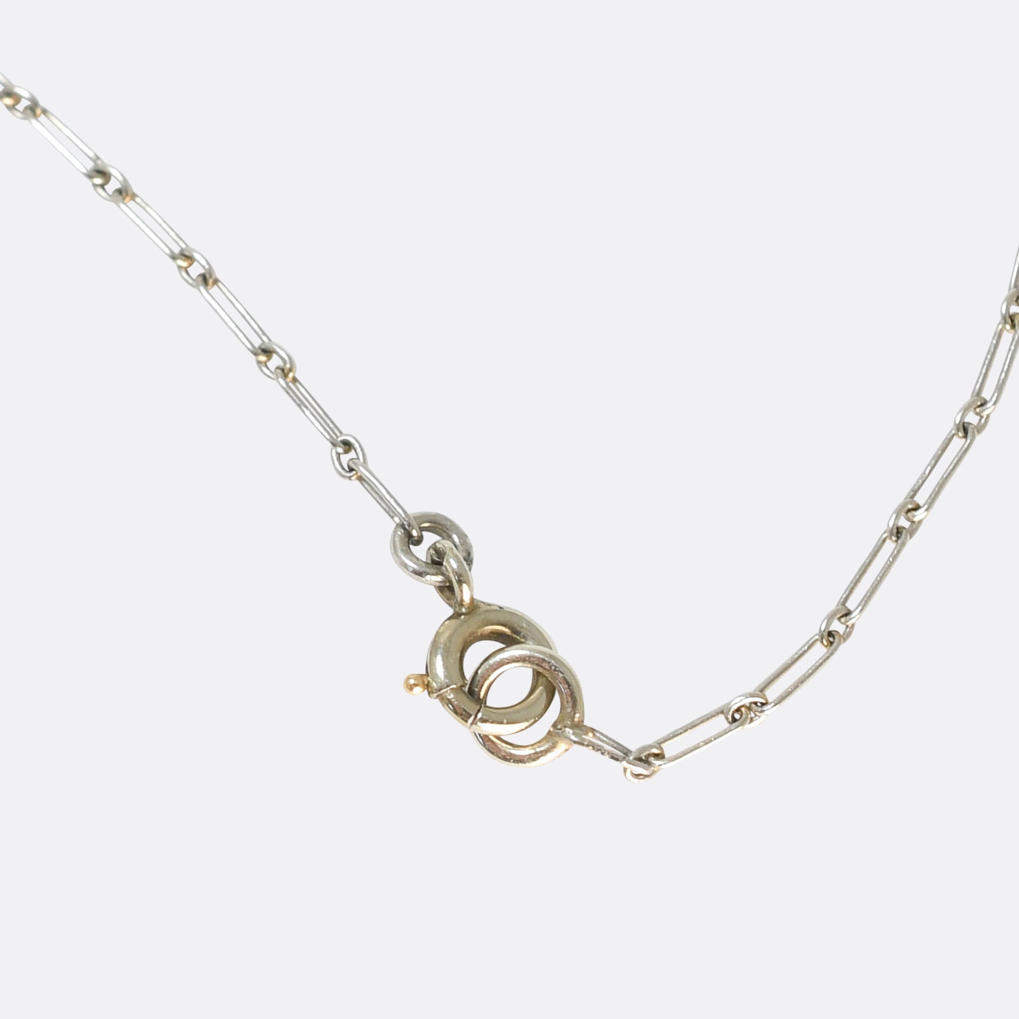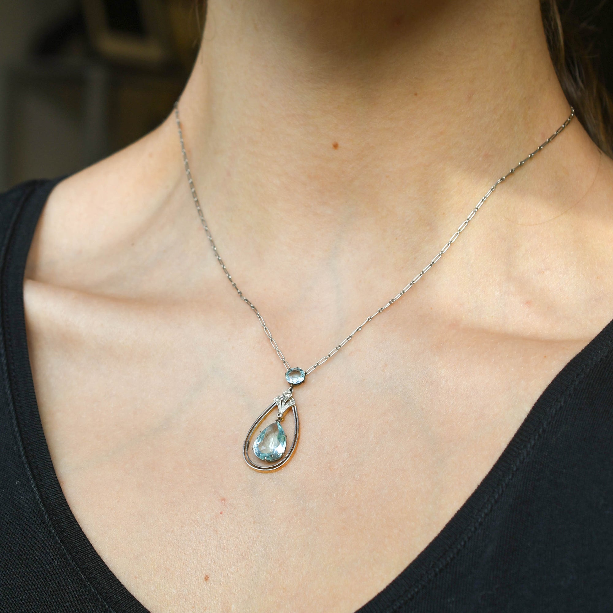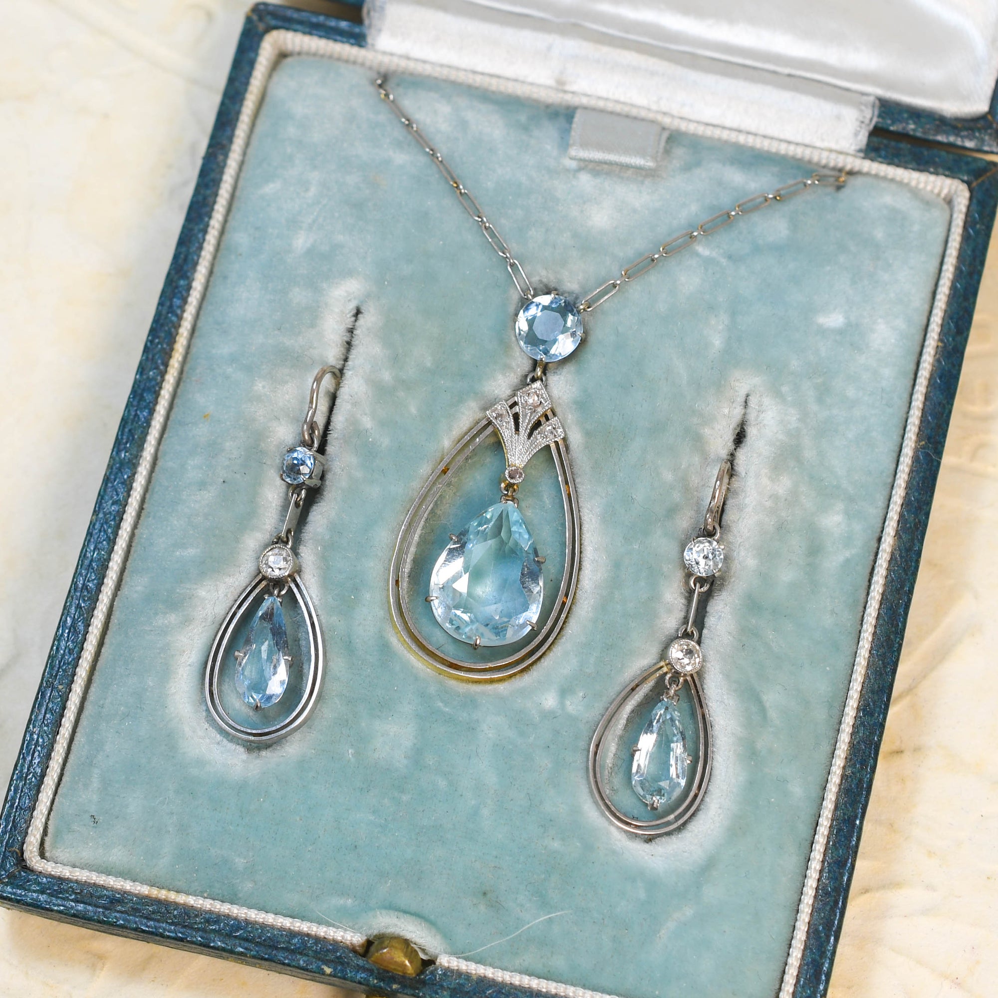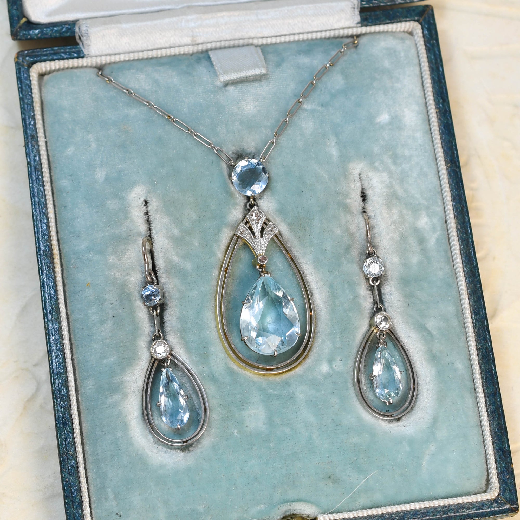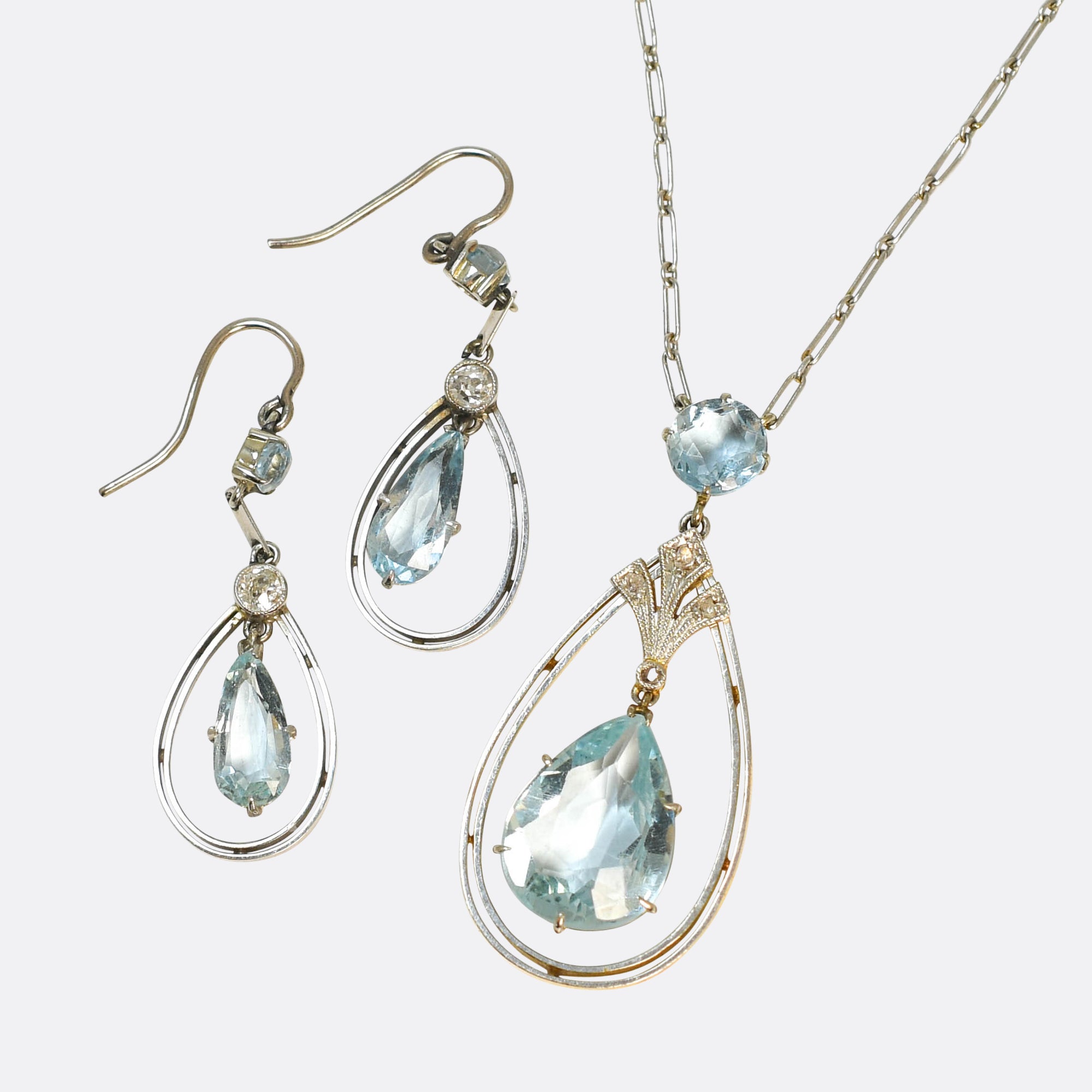 This stunning antique set (or Demi-Parure) is made up of a necklace and a pair of earrings. Both are set with gorgeous aquamarine drops and tops, finished with fine diamond platinum millegrain within pear shaped open work halo drops. The articulated drop of the necklace features a lovely 3.09ct pear shaped aquamarine, which hangs freely from diamond millegrain details and a further 0.37ct aquamarine. The piece hangs from a fine platinum chain, with a wearable length of 17 inches. The earrings are perfectly matched with the necklace, featuring the same design with 0.54ct pear aquamarine drops and 0.10ct tops. It modelled in 15k yellow gold with platinum settings, comes complete in its blue velvet fitted box and it dates from the Edwardian period, circa 1910.