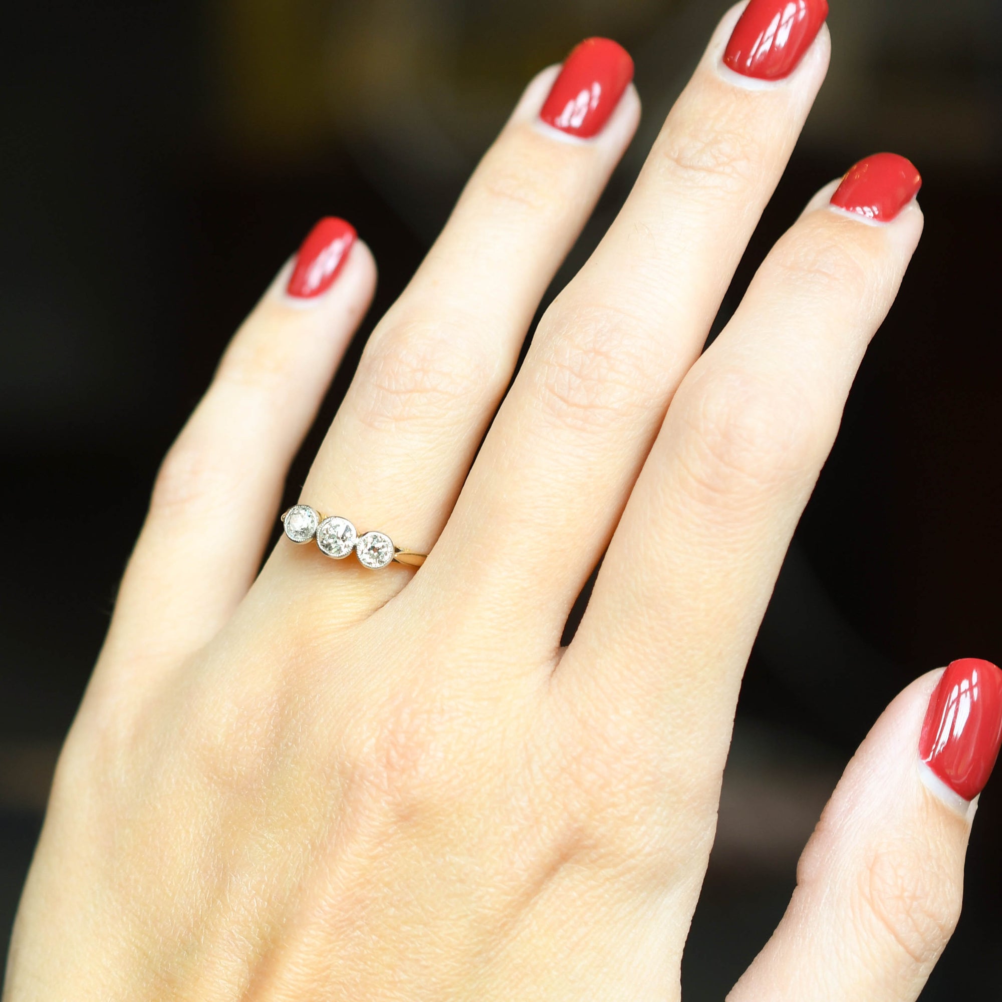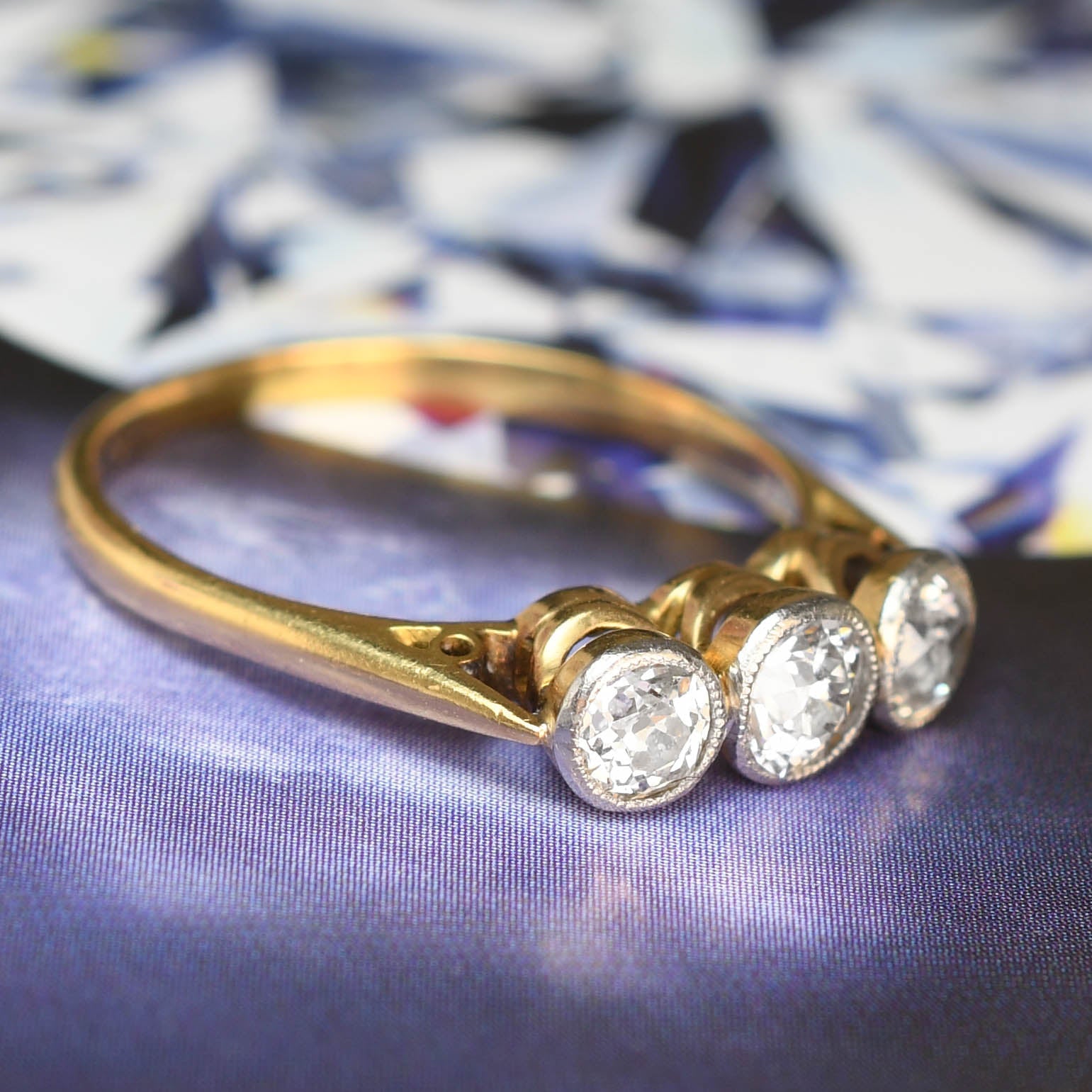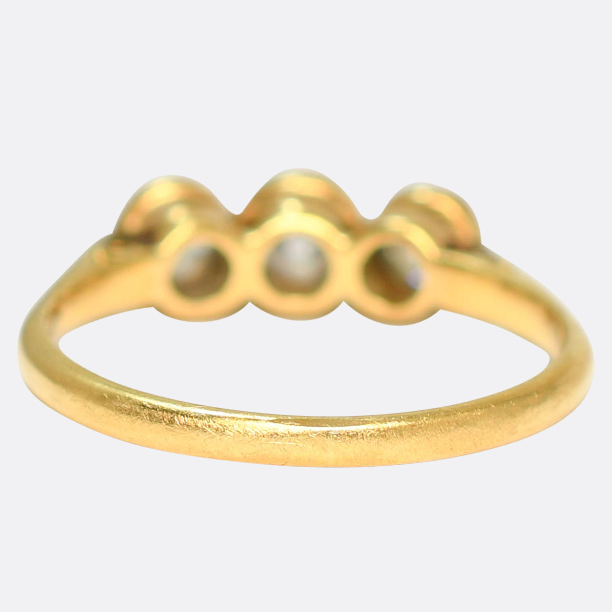 A gorgeous diamond trilogy ring dating to the Edwardian period, circa 1910. The three old cut diamonds, 0.60ct total, are pretty and sparkly, bezel set and surrounded by lovely platinum millegrain. The three stones of a trilogy are said to symbolize the past, present and future- perfect for an engagement ring! It features an open gallery and subtly pinched shoulders, modelled in 18 karat gold.
