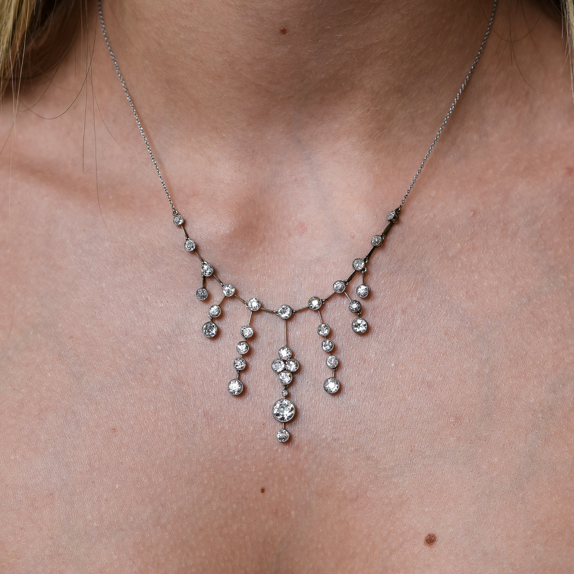 Pure elegance... A stunning antique multi-drop/swag necklace dating from the Edwardian period, circa 1910. It's set with a variety of small and large transitional cut diamonds dangling freely beneath eleven sparkling diamond tops, approx. 10 carats total!! The stones display great sparkle, shine and icy white colour, and their open backed settings enhance these qualities as the light shines through them. It's crafted in platinum throughout and has a wearable length of 18 inches.