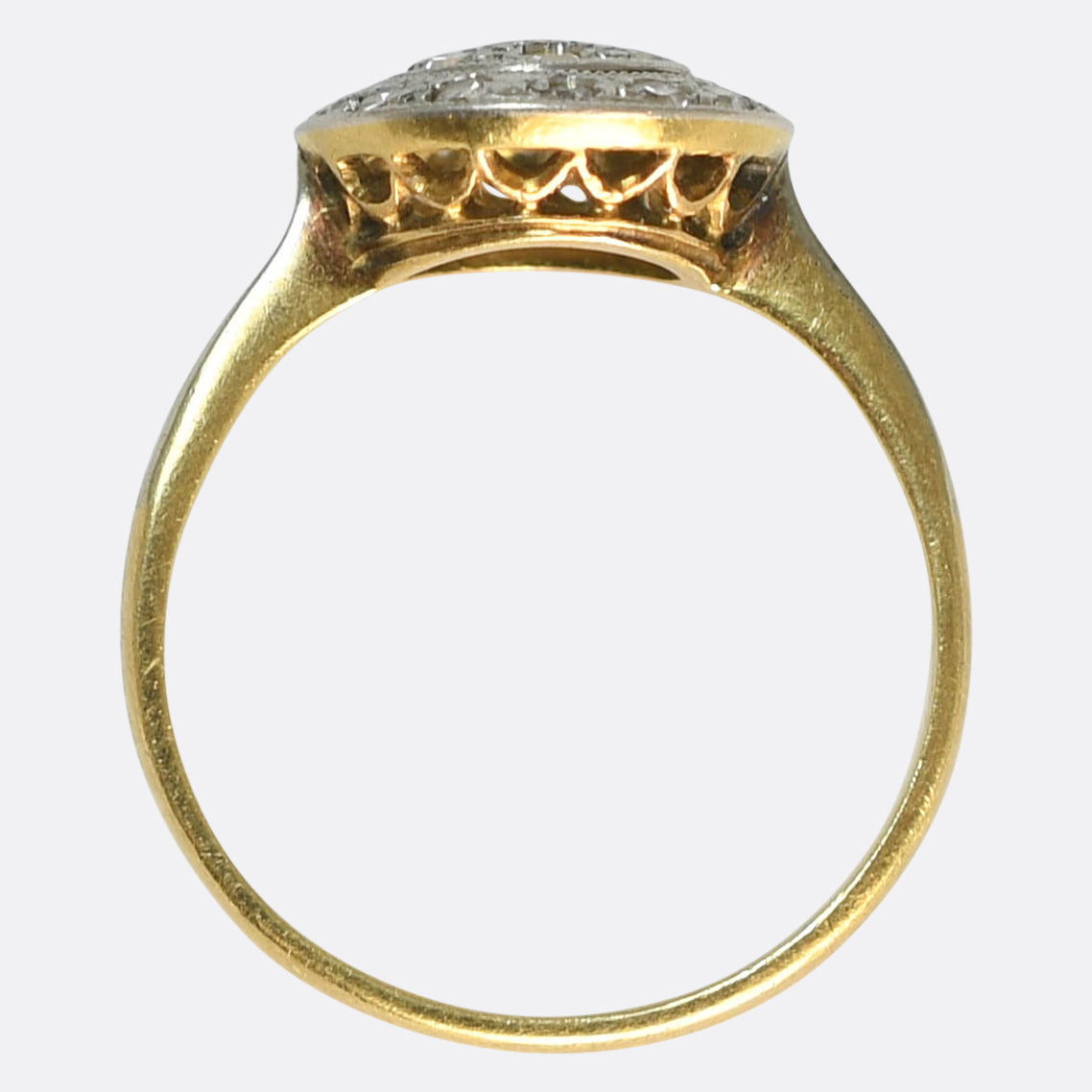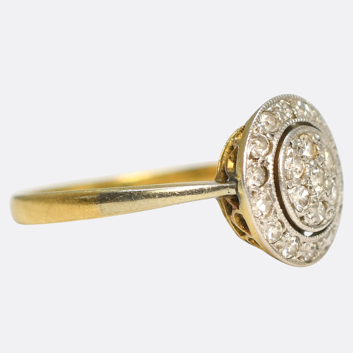 A super pretty Edwardian ring modelled as a target. Perfectly formed, the round head is set with gorgeous diamond and platinum millegrain details, with open work detail creating a halo surround. The platinum spreads to the pinched shoulders, meeting with the slim 18k yellow gold band. It features a lovely pierced gallery with open backed settings, allowing the light to shine in behind the stones.