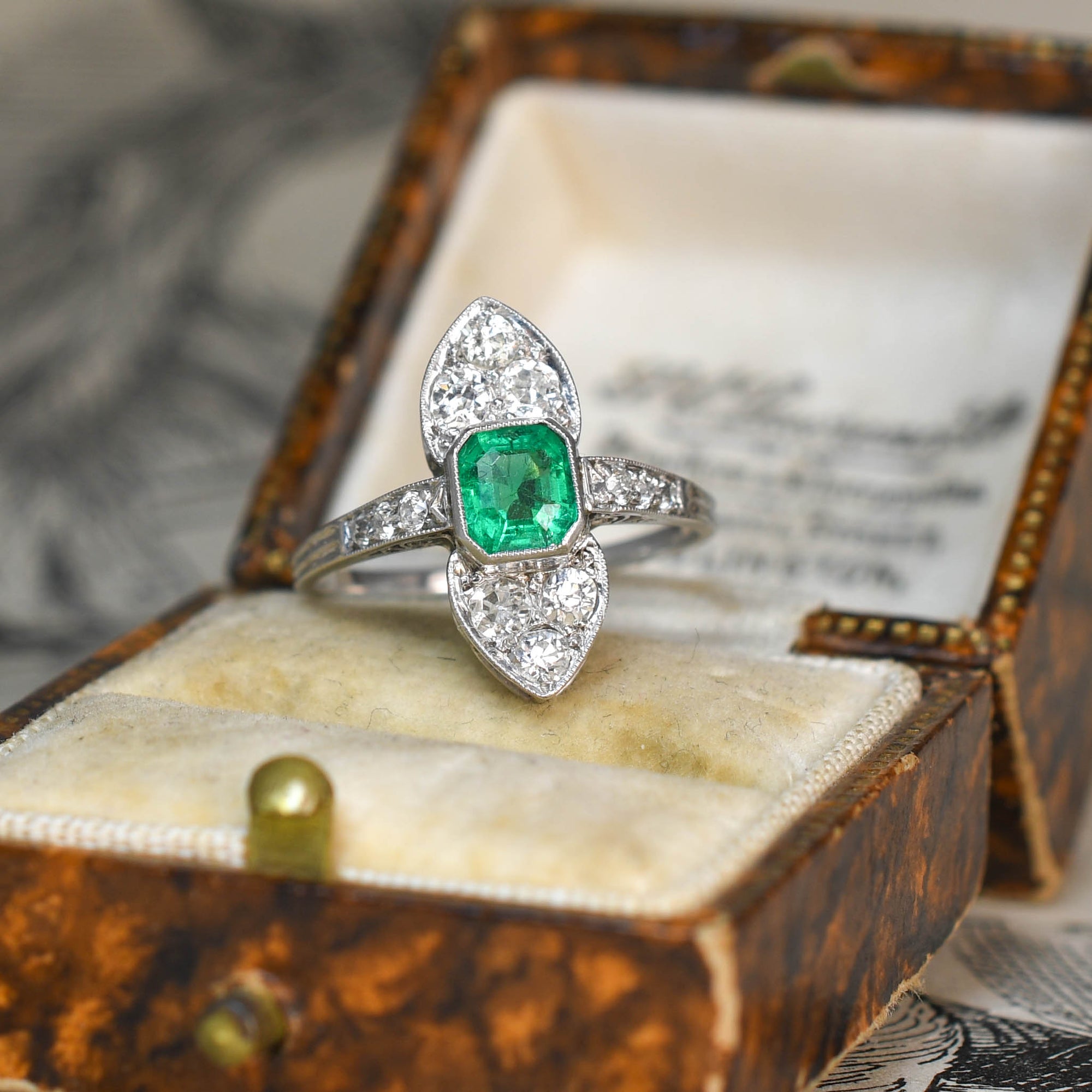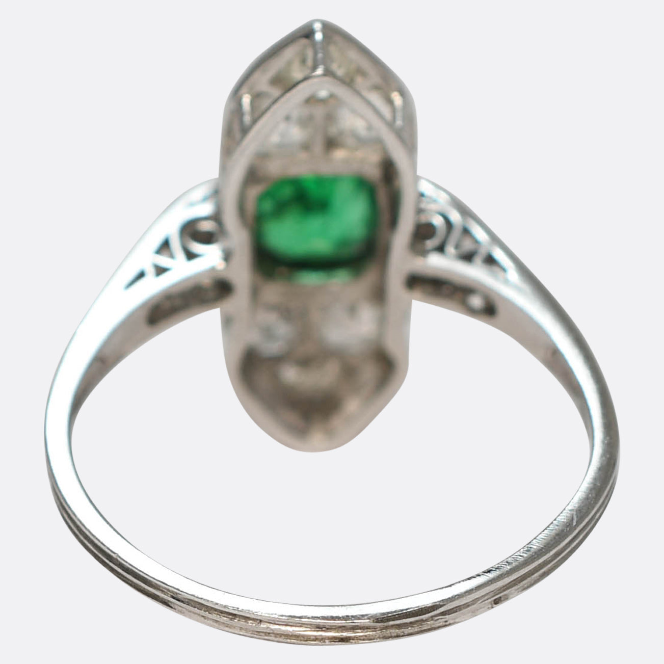A stunning antique cluster ring dating from the Edwardian period. It rests North/West along the finger, with two diamond cluster points and a dreamy emerald centre. It displays a stunning juicy emerald green colour, 0.59 carats, complimented by the icy white diamonds and platinum band. With a lovely open worked gallery and slim ribbed band, it remains in lovely condition- probably one of my favourites in a while!