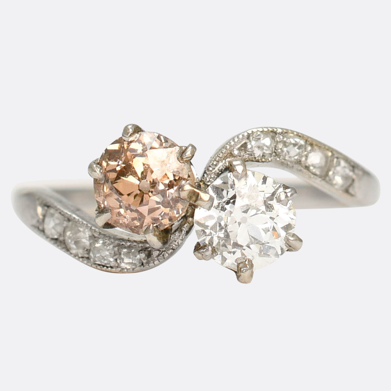 This stunning antique "Toi et Moi" ring dates from the Edwardian period, circa 1910. The main stones are two gorgeous old European cut diamonds , weighing around half a carat each. One displays a dreamy pinkish brown hue, and the other bright and white. Modelled in platinum throughout, sweeping shoulders curve around the head, meeting between the two stones, further set with old mine cuts. Perfect for an engagement ring, for those who like a "touch of pink".