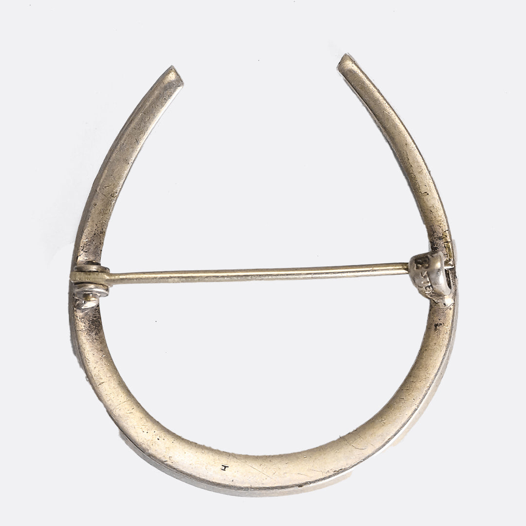 A lovely and delicate antique horseshoe brooch pin dating from the Edwardian period, circa 1910. It's set with dreamy pearls, that graduate in size, and is crafted in sterling silver throughout.