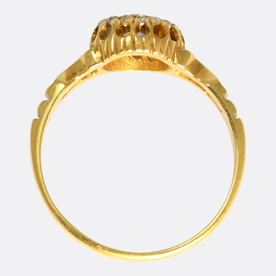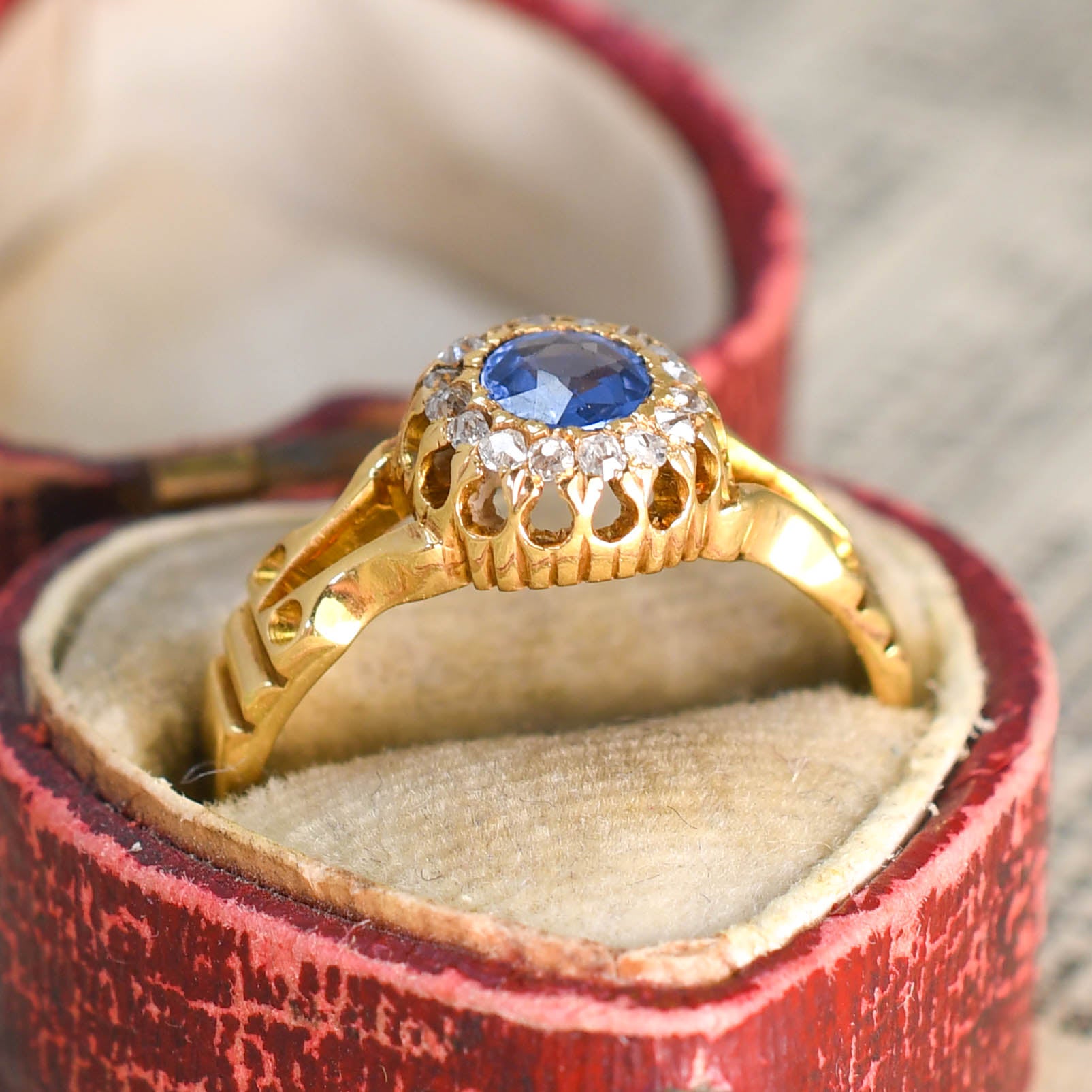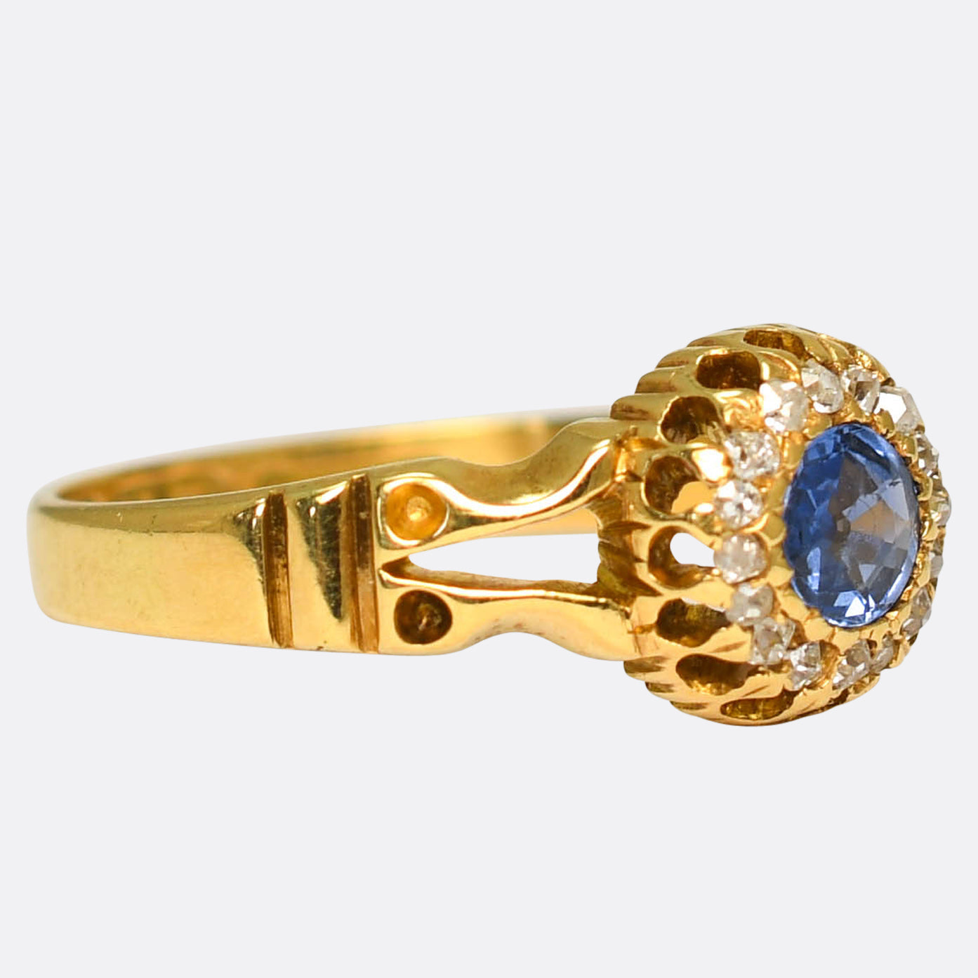 hallmarks for 18k gold, Birmingham assay office and the year 1898... The sapphire displays a velvety blue colour, while the diamonds are bright and full of life. It fits very flush to the finger, a nice little understated ring, and it features gorgeous openwork to the shoulders.