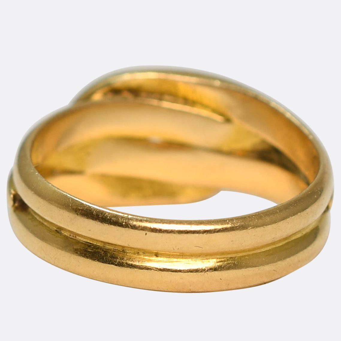 This fantastic Edwardian period snake ring is crafted in rich 18k gold throughout, and it wraps around your finger two times... It's modelled with two snake heads, and they rest together in a kind of snake hug and coil. Each snake is set with striking ruby cabochon eyes, with little detailed heads that meet in the centre of the band. It remains in gorgeous antique condition and looks great worn as part of a ring stack or even on its own.