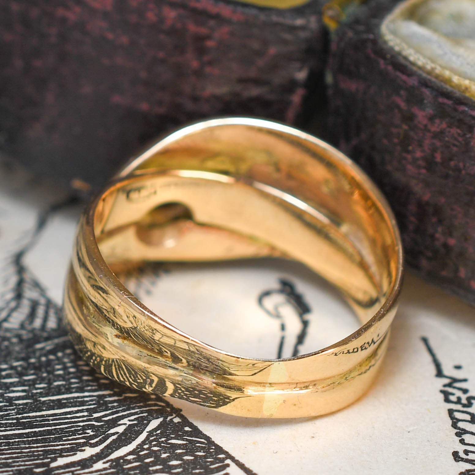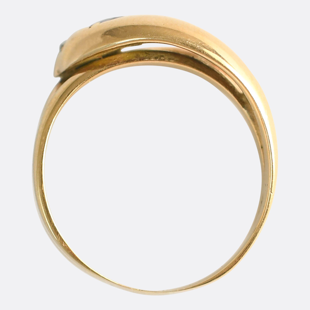 With English hallmarks, this snakey ring is dated to the end of the Victorian era and the beginning of the Edwardian period, 1901. Modelled in 15 karat rosey/yellow gold, this snake is a chunky example, set with a sapphire "brain" and rose cut diamond eyes. Its body wraps around your finger two times, with its gem-set head and tail meeting in the centre. As well as looking badass, snakes can be seen as a symbol of eternal love, wisdom, healing and fertility.