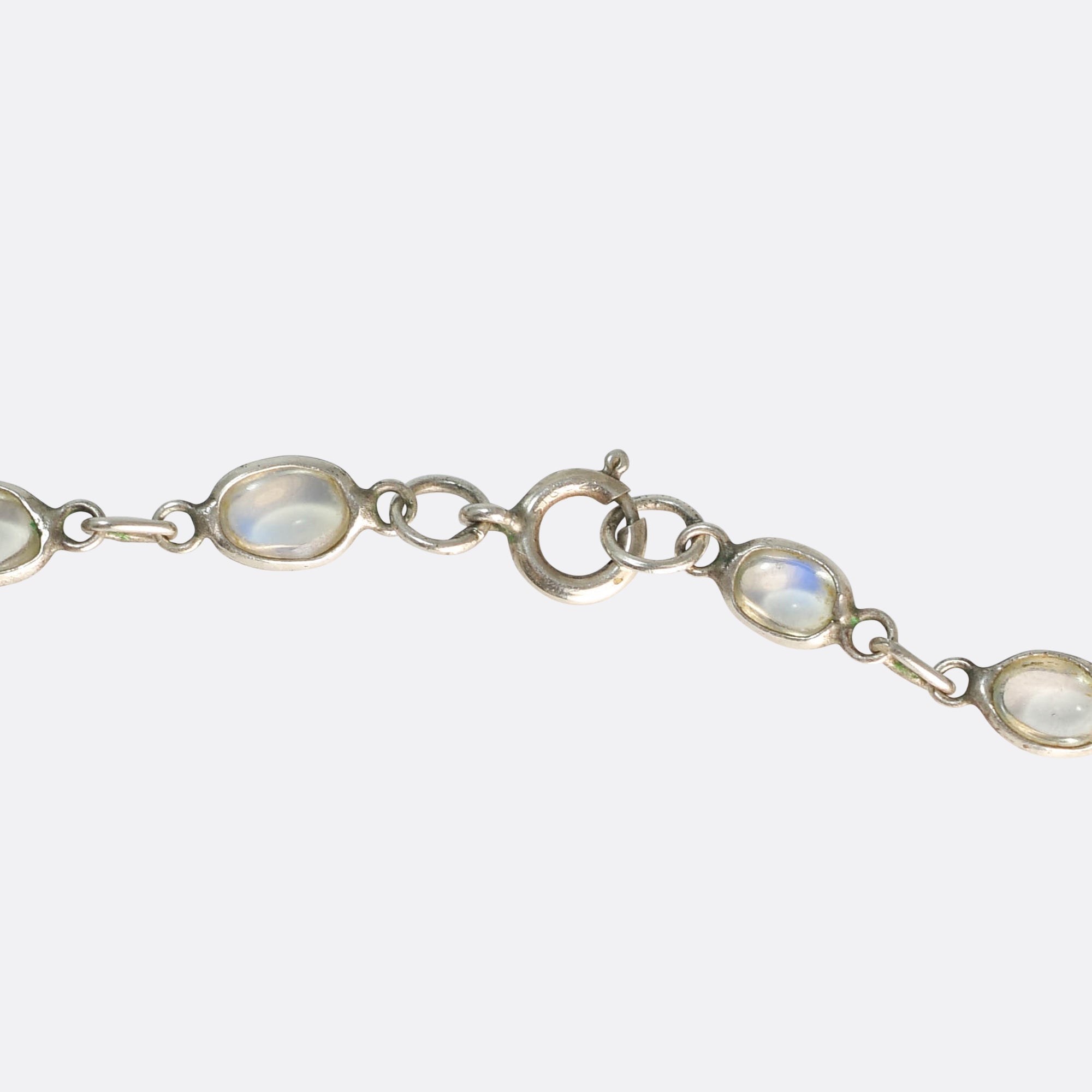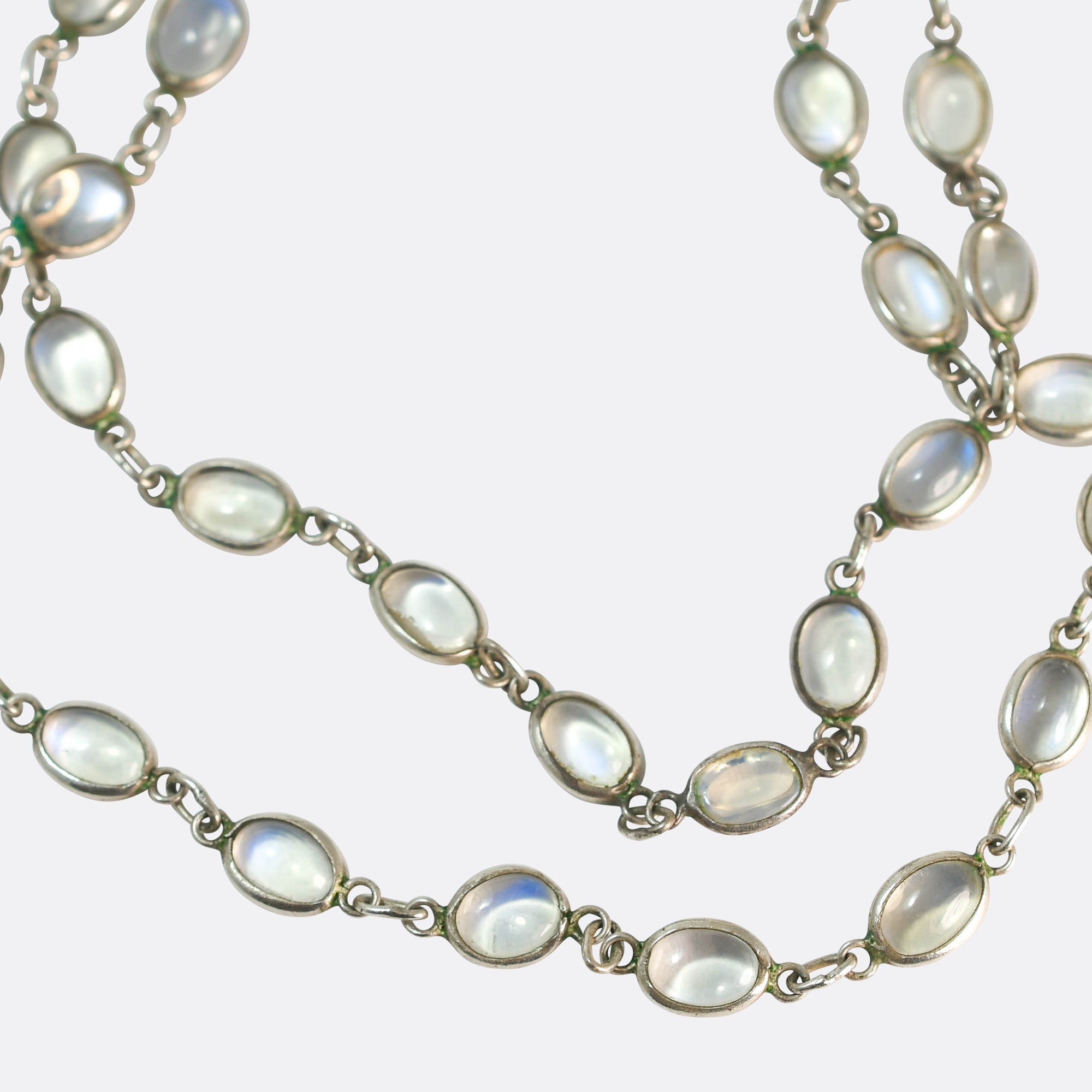 This super dainty antique chain necklace dates from the Edwardian period, circa 1910. Modelled in silver throughout, it has a wearable length of 25 inches and is set with dreamy moonstones... They each display that well known adularescence, whereby the light pools inside the stones and they appear to shimmer and glow! It remains in lovely antique condition and rests beautifully against the neck.
