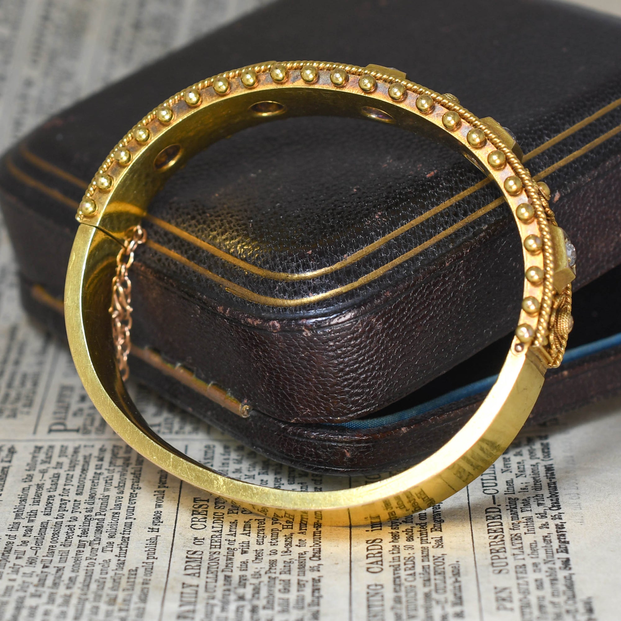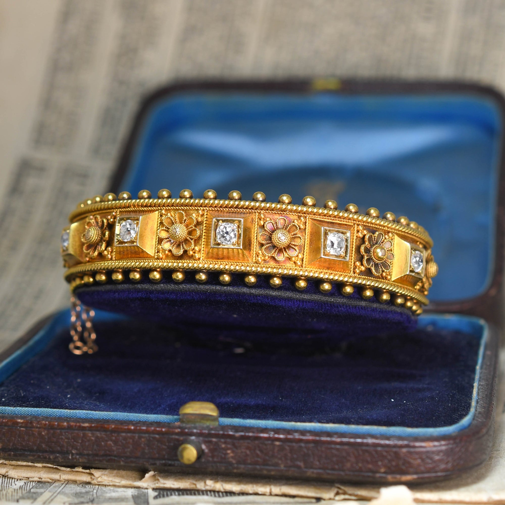 This charming Etruscan Revival bangle is beautifully crafted in 15 karat yellow gold throughout. It features lovely flower motifs, alternating with around half a carat of chunky and bright old mine cut diamonds, set in high profile square settings. The gorgeous row of diamonds and flowers are encased in fine ropework detailing, with pommels surrounding the entire head of the piece. It fastens with a concealed clasp (with gold safety chain), fitting a 6.3 inch wrist. Comes complete with fitted box.