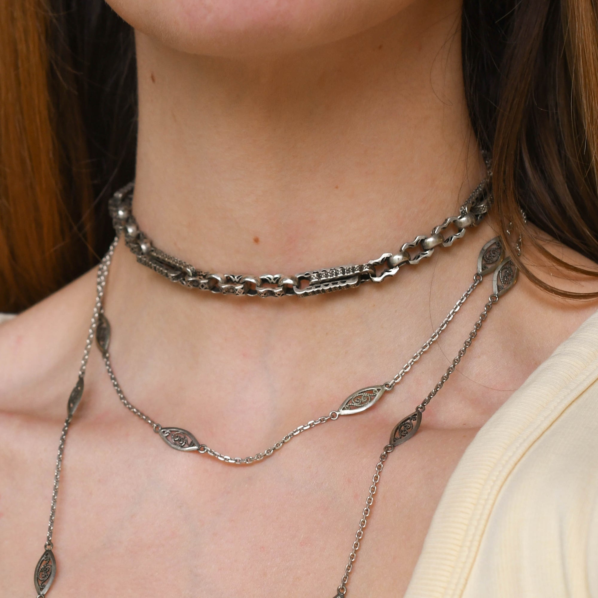 The next silver chain is typically Art Nouveau in style, each link is gorgeously open worked with scroll motifs. It has a wearable length of 45 inches, and can be worn long or doubled to create a stylish layered look.