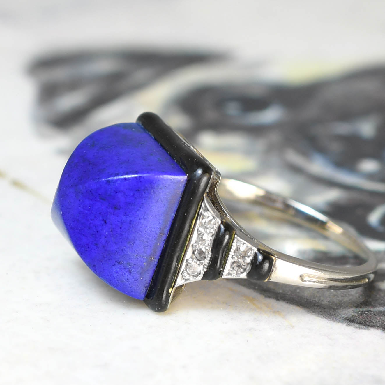 French Art Deco Sugarloaf Lapis Lazuli, Diamond & Enamel Ring