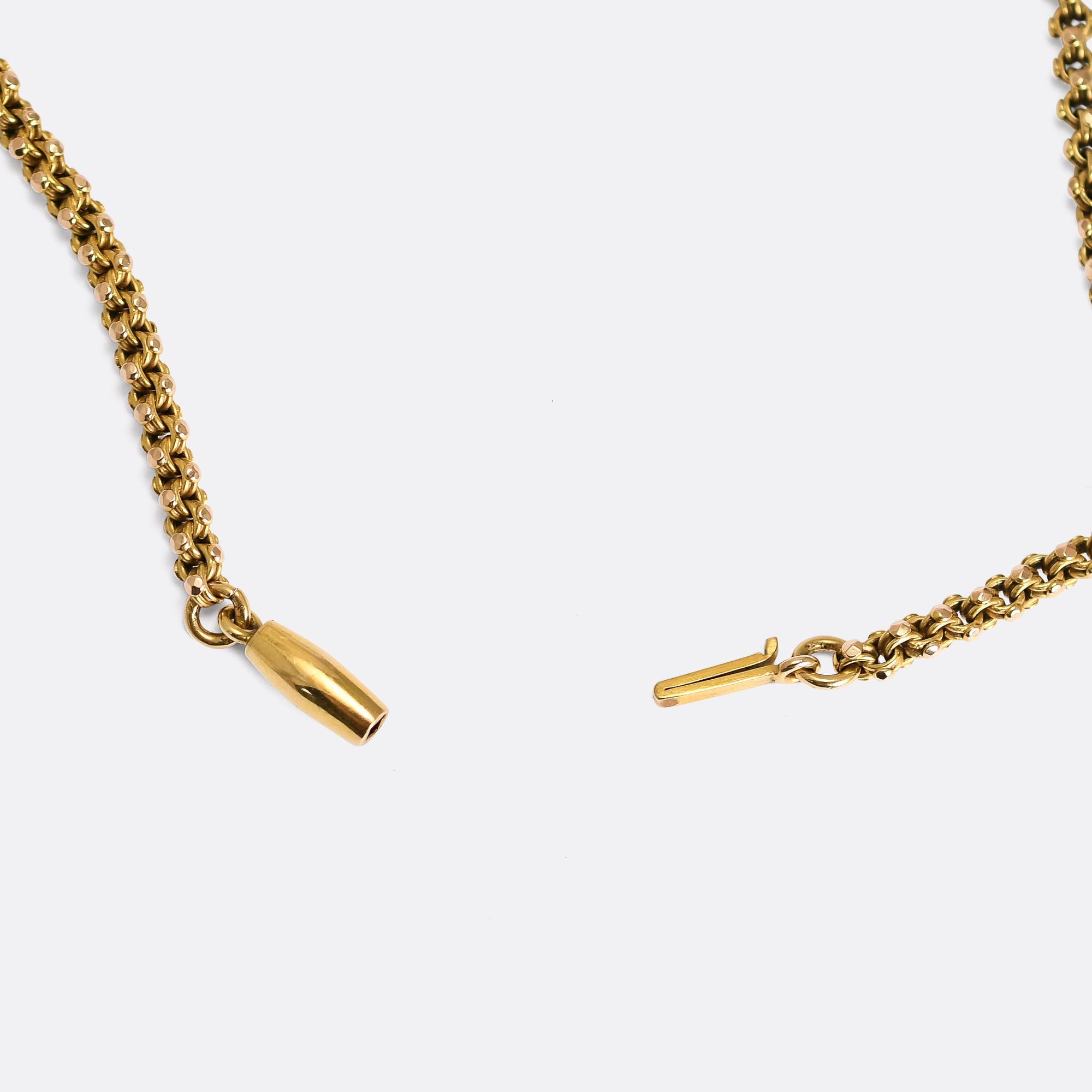 A particularly high quality Georgian c.1830 solid 18ct gold chain with barrel clasp and textured links. sitting at 18 inches, it's versatile and simple 21.5 grams. quite different to your usual Georgian chain which is generally quite light weight and almost always hollow & thin. this example is quite chunky.