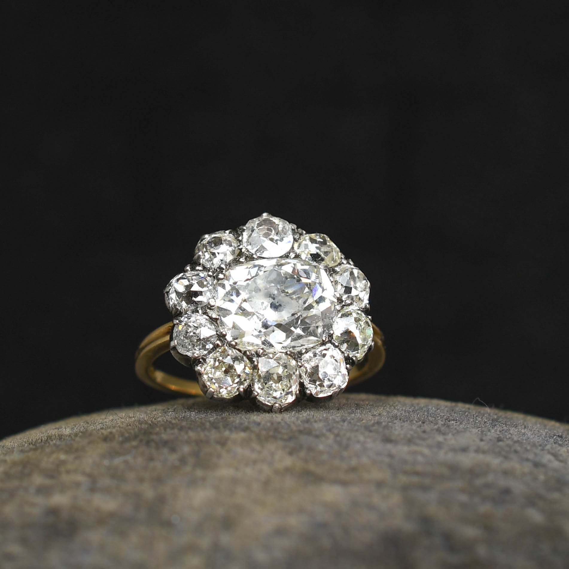 This breath-taking antique cluster ring is dripping with old cut diamonds... Set with a total of 5.36 carats, it dates from the Georgian period, circa 1820. The centre stone is of a gorgeous cut, with each of its facets hitting the light as it moves across your finger. It weighs at 2.86 carats, and is highly bright, sparkly and chunky. Surrounding this is a cluster of further old cuts, 2.5 carats total, each just as sparkly, creating that gorgeous flower cluster head. Each of the stones rest in cut down settings- typical of the period- with an open worked gallery and super fine ribbed gold band, in rich 18 karat gold. It features later added marks to the inner band "1909", most likely a gift from one lover to another...And the piece itself remains in lovely antique condition.