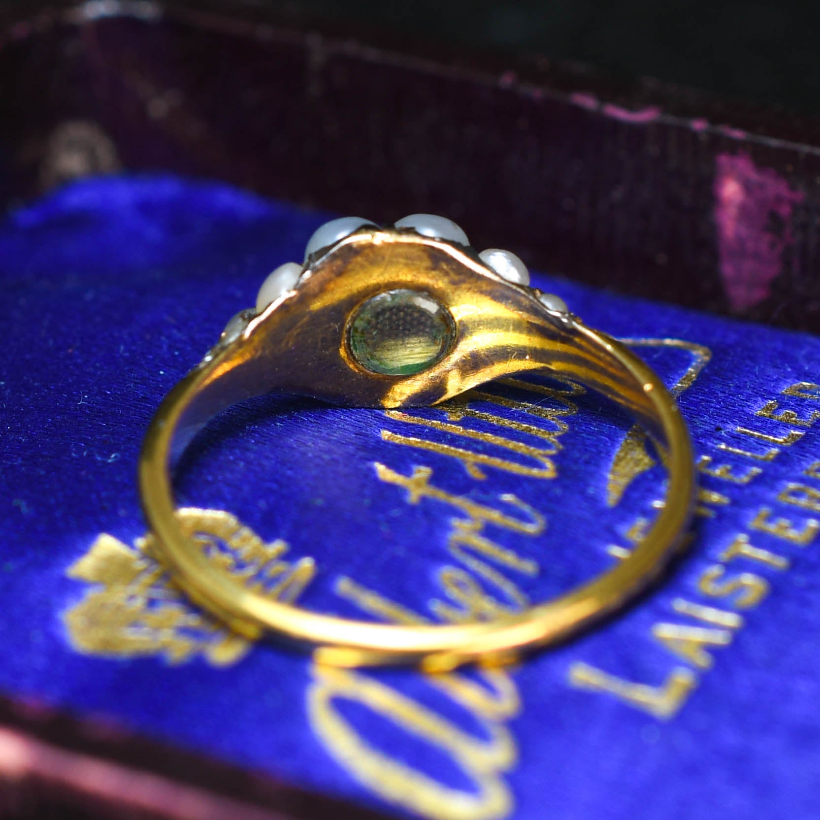 A charming Georgian cluster ring with a secret... the back of the head features a small locket compartment, to hold a keepsake discretely against the finger. The dainty head is set with a cluster of pearls in a flower formation, the stones spreading out to each shoulder whilst graduating in size. In the centre rests a gorgeous natural emerald, a great contrast to the dreamy white pearls and yellow gold band. Its crafted in 15 karat gold throughout, and dates to circa 1820.