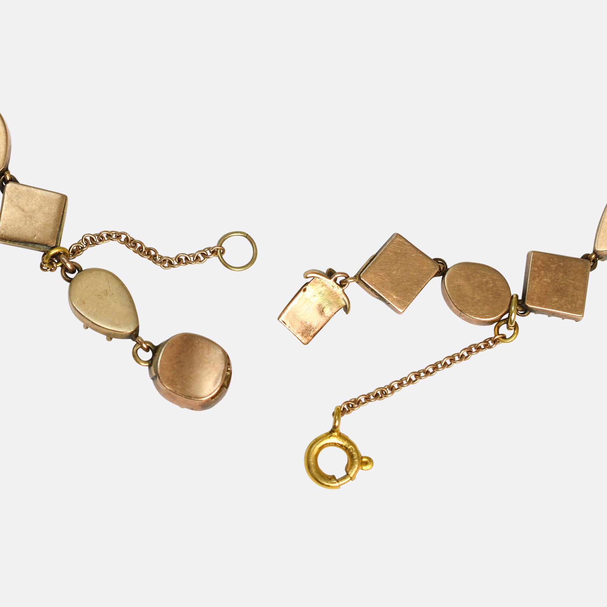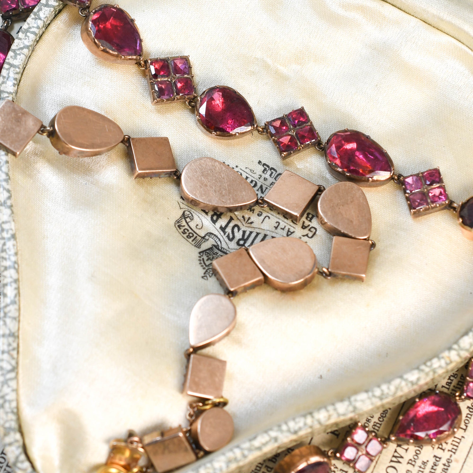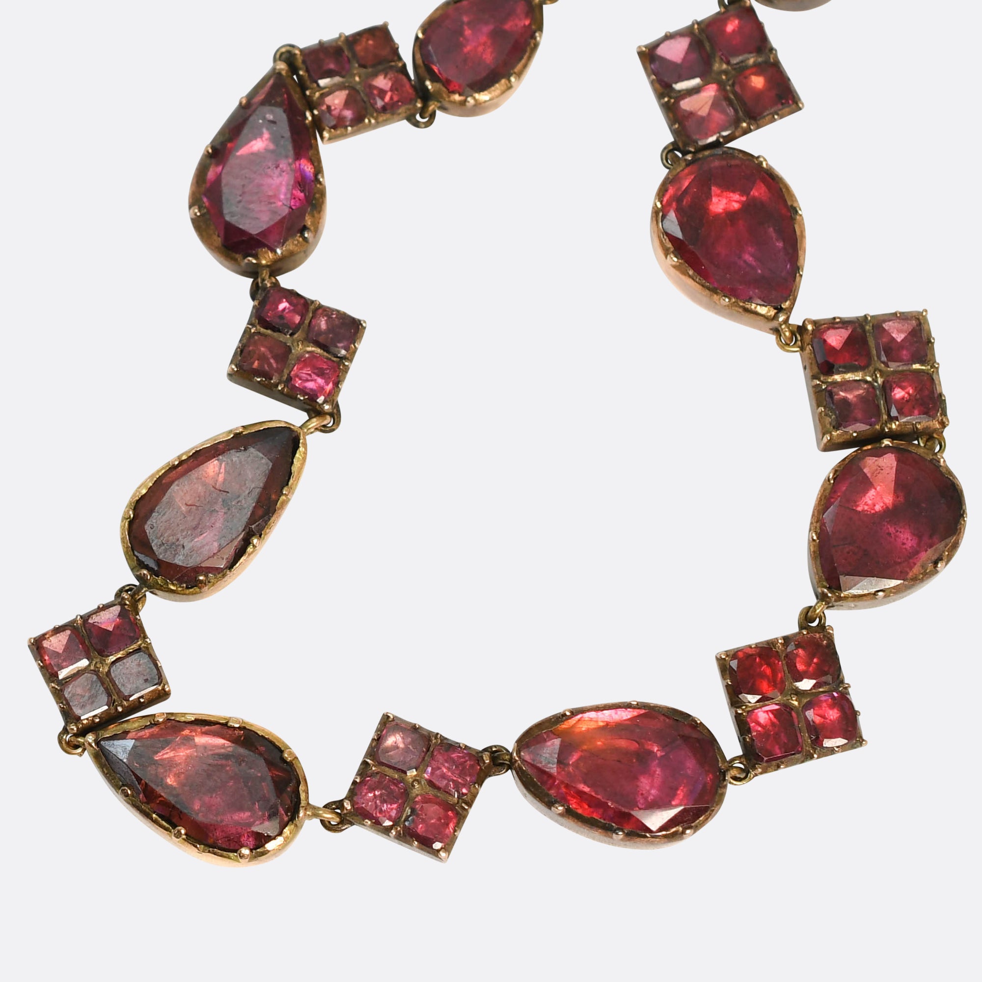 A mouth-watering Georgian rivière necklace made up of juicy almandine garnets, graduating in size across the chain. Each link is set with an alternating cut of the gem- gorgeous oval and pear cuts with square/diamond shaped motifs set with four garnets each (approx. 26.38ct total). Its modelled in 15k gold throughout, and the stones are foil backed enhancing their rich colour and sparkle against the typical Georgian rosey gold settings. It has a wearable length of 16.5 inches and fastens with a concealed clasp and fine safety chain, and it remains in lovely condition considering its age!