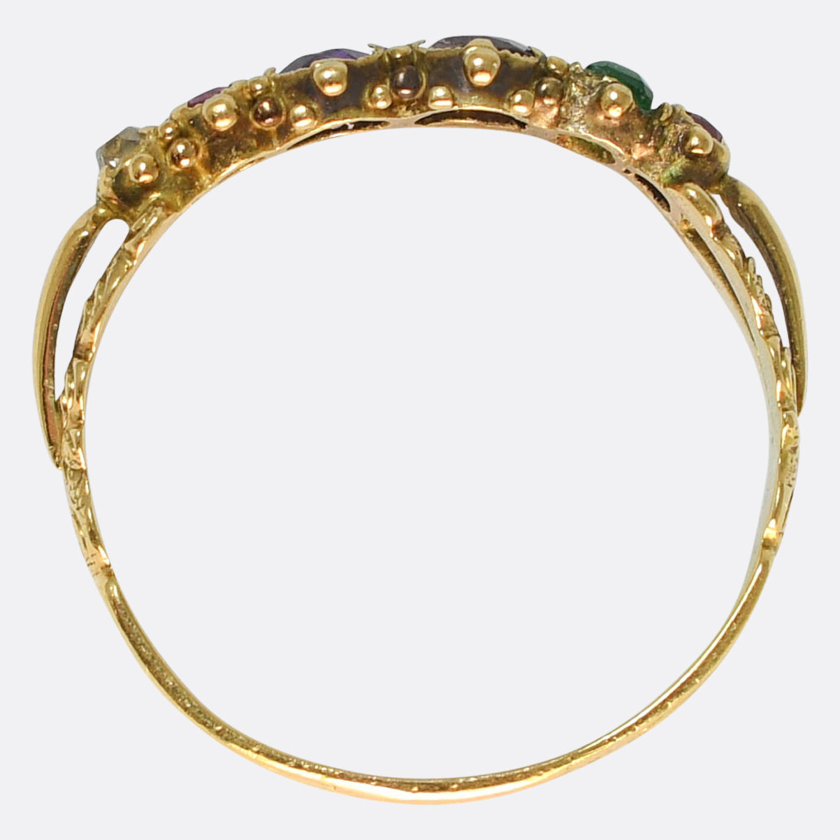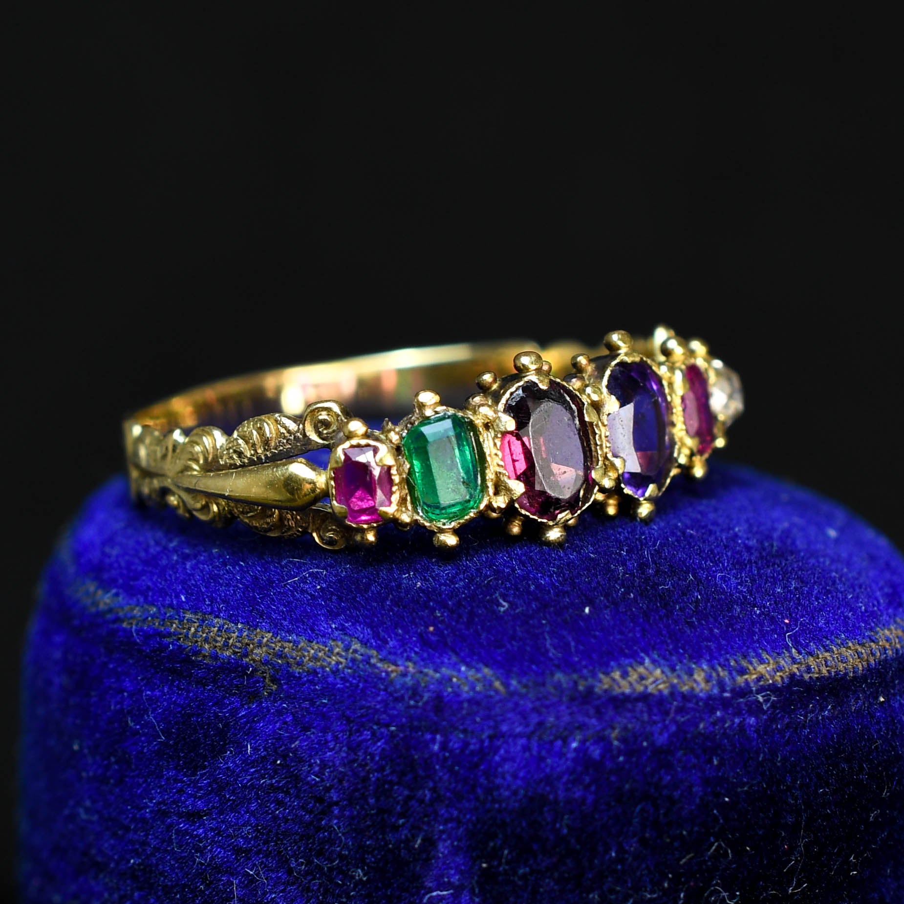 This stunning Georgian ring features an acrostic message across the top in gemstones- Ruby, Emerald, Garnet, Amethyst, Ruby and Diamond. REGARD. They're set in open backed settings, with gorgeous pommel details, split scrolled shoulders and a finely engraved band. Its modelled in 18k gold throughout, and remains in lovely antique condition.