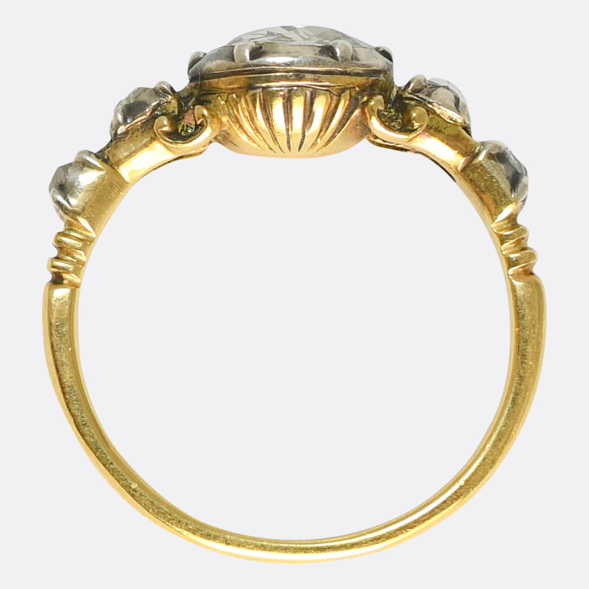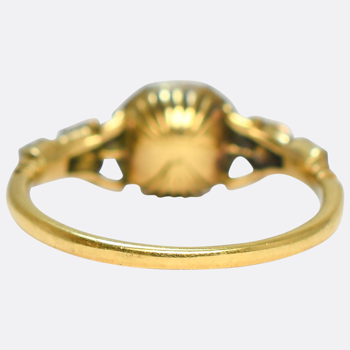 This fantastic Georgian ring is set with a chunky and sparkly 1.36ct old min cushion cut diamond centre, in a foil backed silver mount and flanked by four diamond (rose cuts) shoulder accents. It's beautifully constructed in 15 karat, with charming split shoulder details and stunning principal stone. The foiled settings are designed to accentuate the chunky facets by reflecting light straight back through the stone enhancing their brightness! A super charming antique ring, still in fantastic condition given its age.