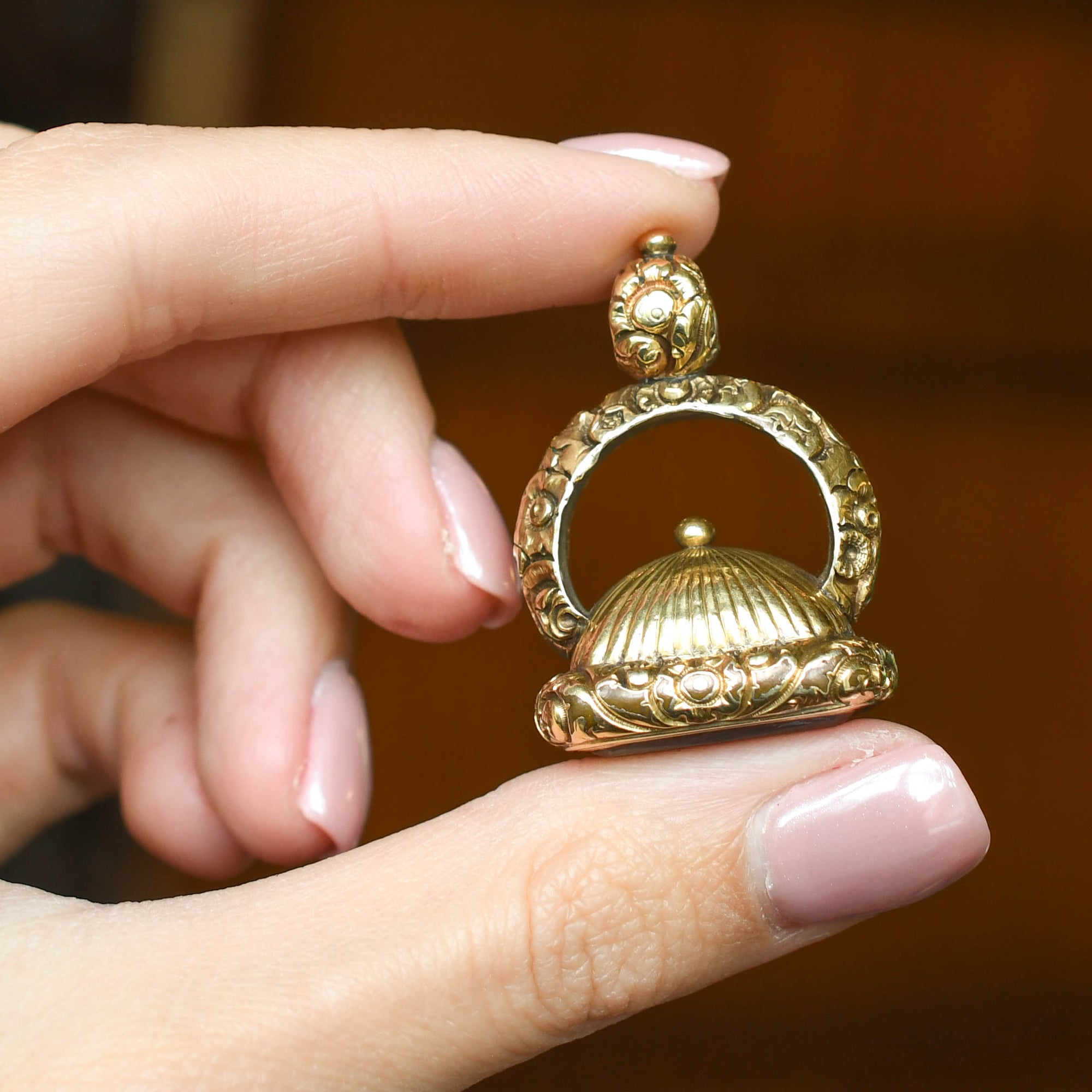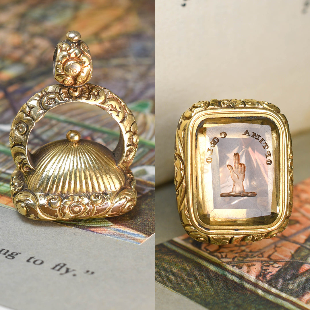"The best things await us in heaven"... I think we could all say that about a loved one, whether that be a person or pet! This charming Georgian intaglio seal fob is set with a foil backed citrine base. Its intaglio carved with the phrase "OPTIMA COELO", which loosely translates to "The best things await us in heaven". Below is a hand with the first and second fingers pointing upwards, and according to Fairbairn's Book of Crests, this links to the Miller family- an English and Scottish surname, and linked to those who kept, operated or owned mills. It was first popularised in the wake of the Norman Conquest of 1066!! A fantastic piece with lots of history, and a beautiful ornate body completes the piece, crafted in 9k yellow gold.