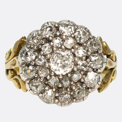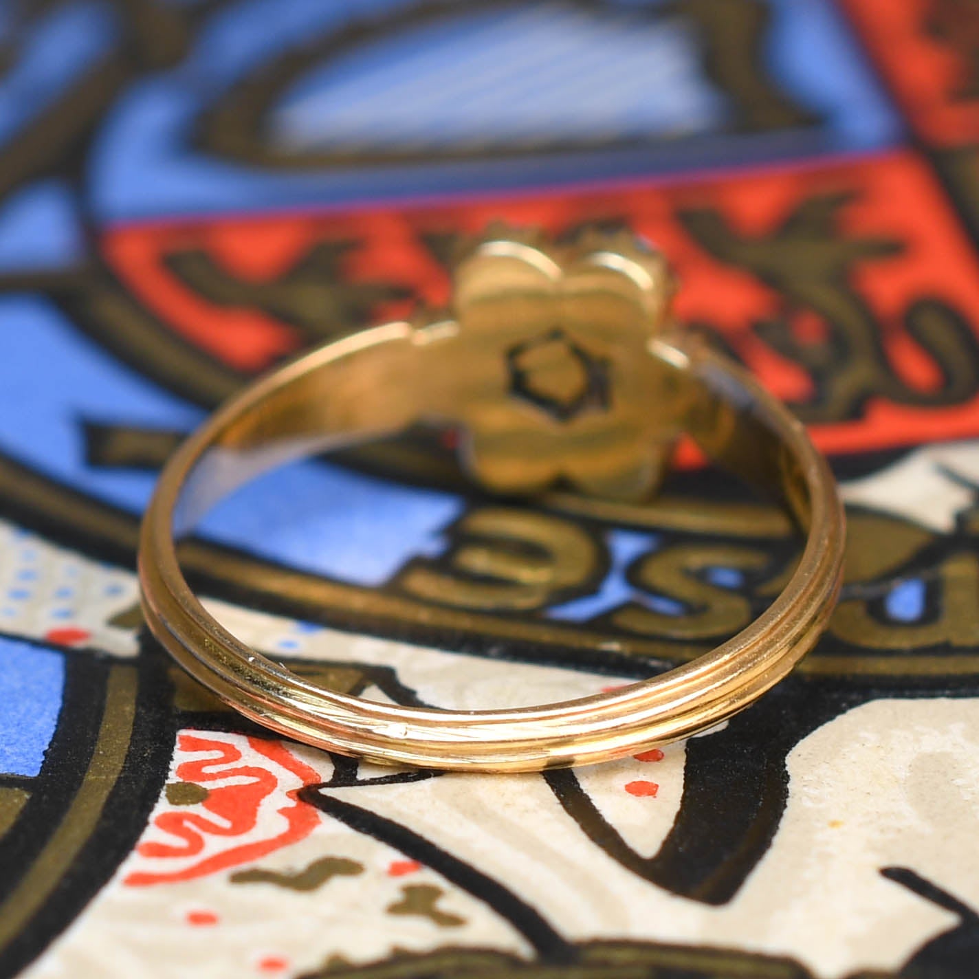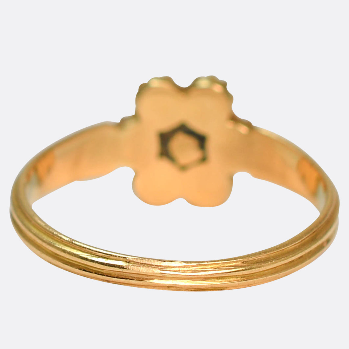A pretty antique forget-me-not ring, with a charming message... Antique jewellery often includes floral motifs, as part of their "Language of Flowers". It had a major impact upon Victorian society, however, it first originated during the Georgian period. Many flowers represented a romantic or emotional sentiment, and in this case, the head is modelled as a forget-me-not flower- for true love. The flower head is set with six vibrant turquoise cabochons with a dreamy pearl that rests in the centre. With a lovely ribbed band, it's crafted in 15k gold throughout and dates from the Georgian period, circa 1820.