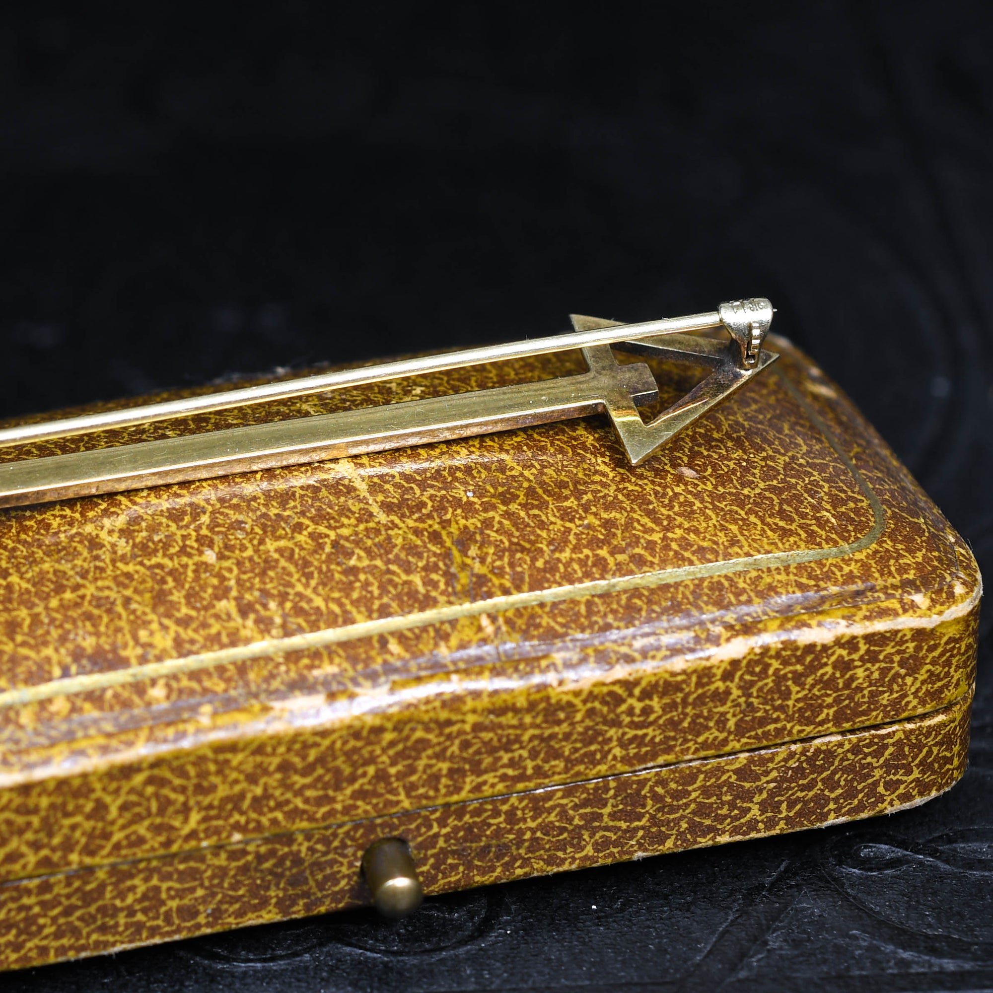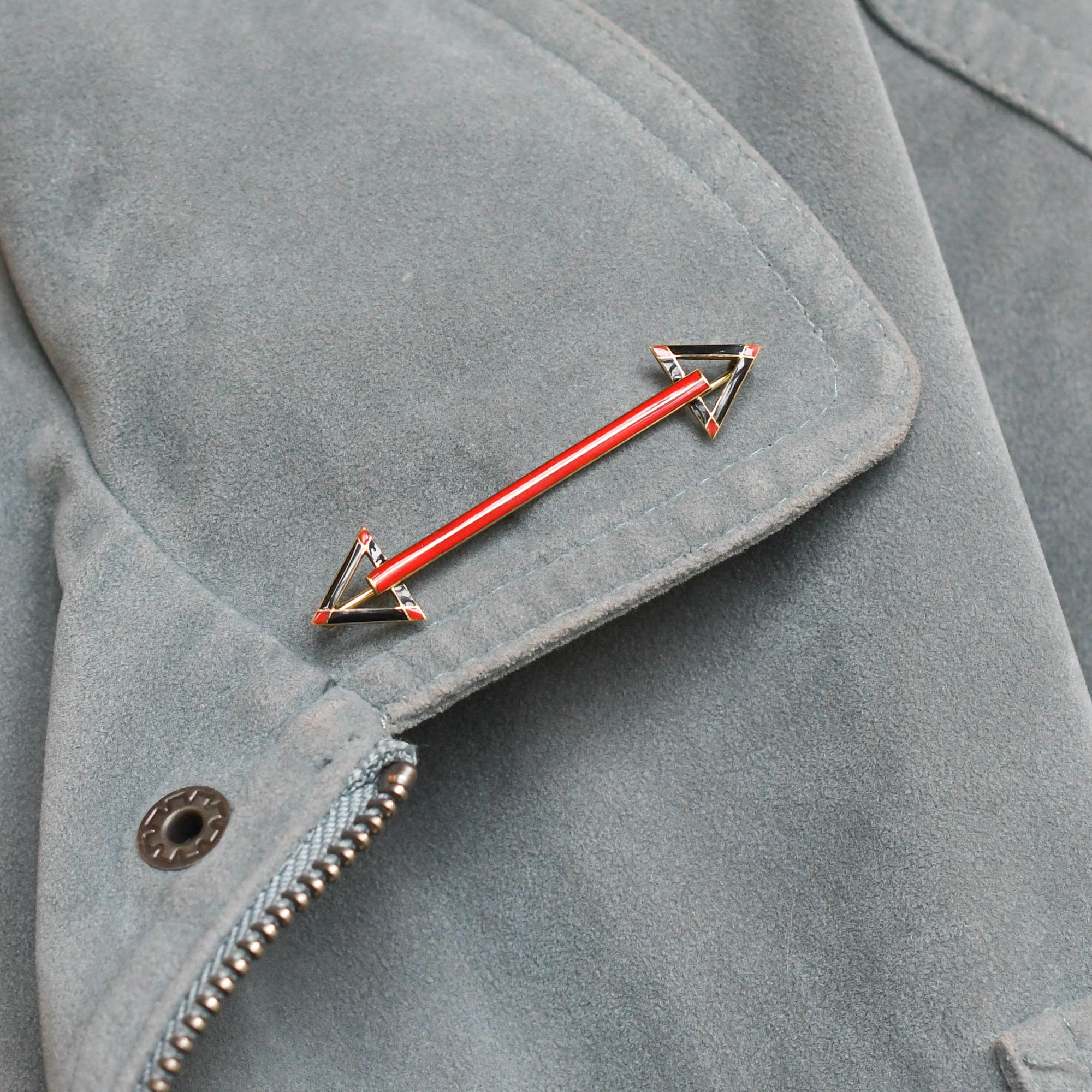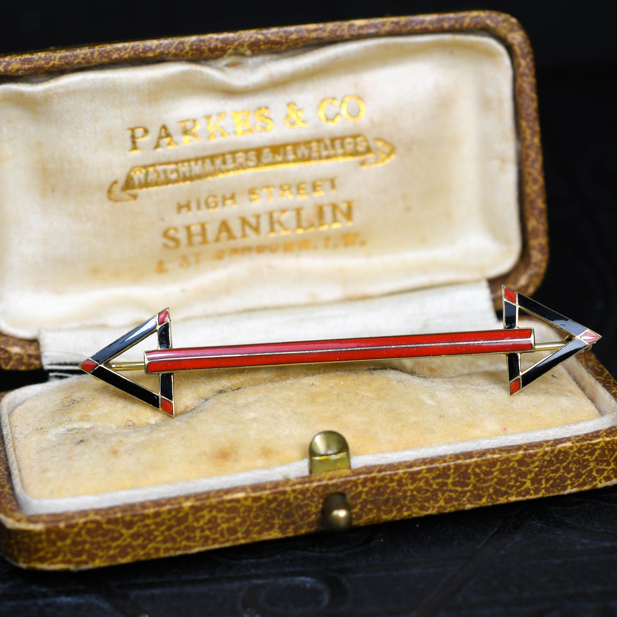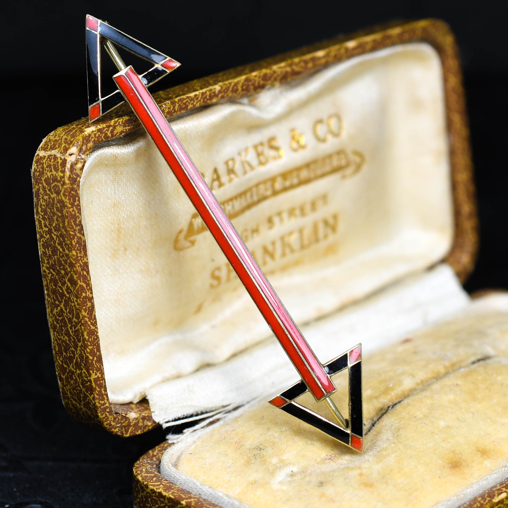 This cool French made double arrow brooch is finished in fantastic enamel work, dating from the Art Deco period, circa 1920. Modelled in 14k gold throughout, the two arrows are finished in geometric black and red enamel, leading to the long strip of red between the two. The two arrows can seen to signify friendship, balance or mutual respect.. And this piece can be worn on your collar, or even as a pendant! Comes complete with fitted box.